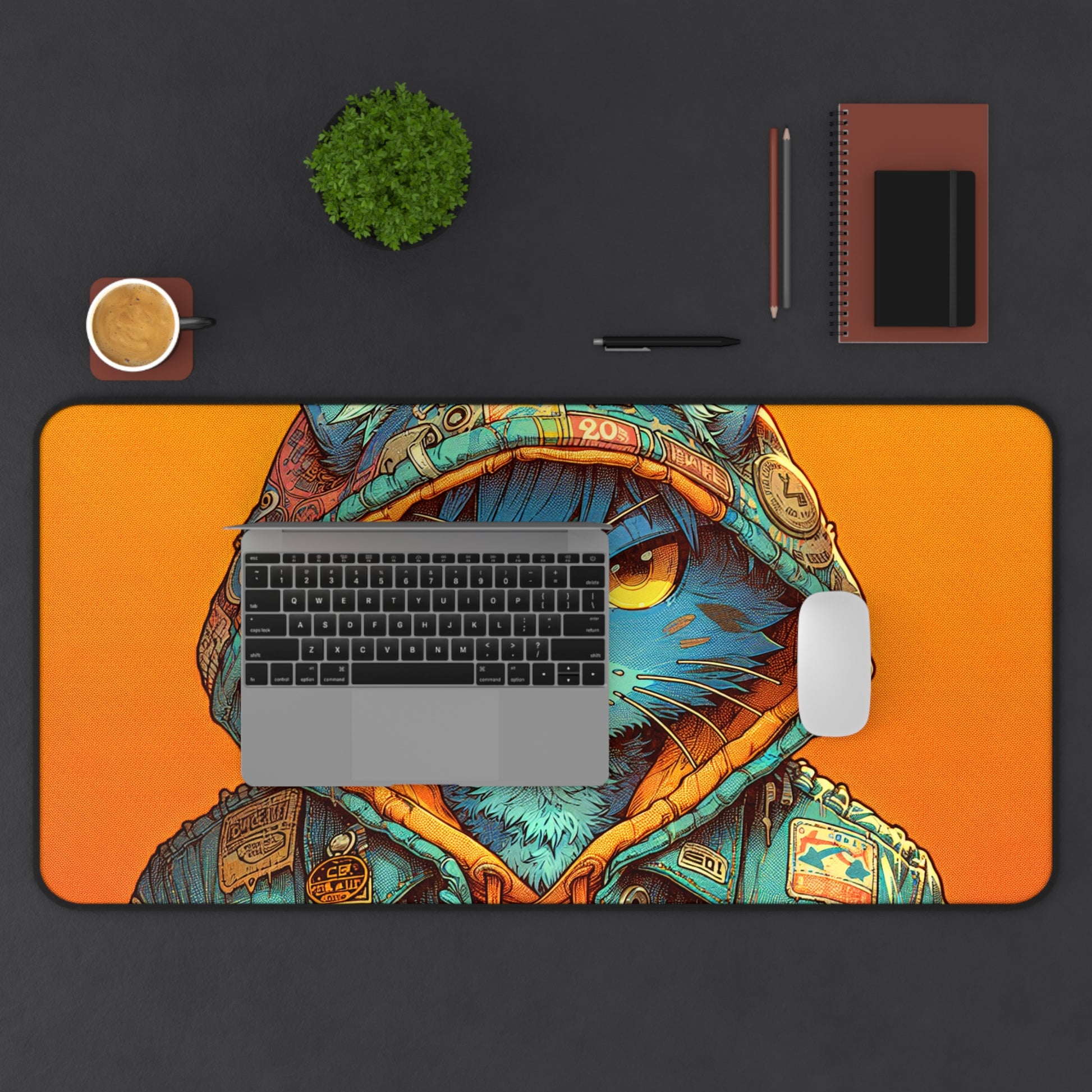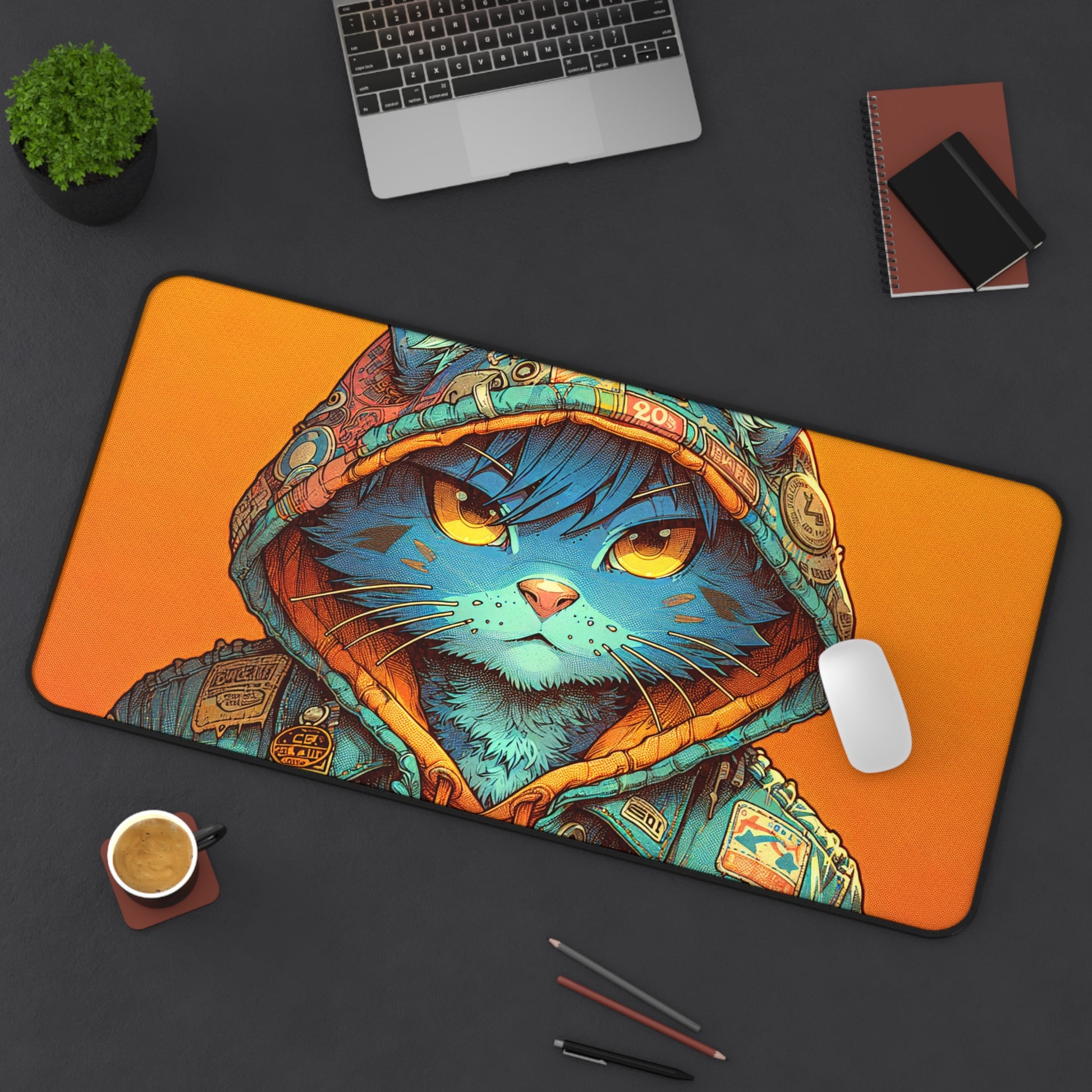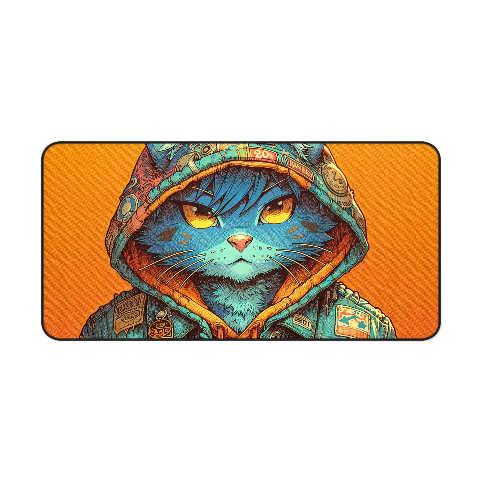 Add a touch of edgy personality to your workspace with the Alley Cat Desk Mat and Mouse Pad. This unique accessory features a bold, gritty design that's sure to turn heads. A blue cat, donning a colorful hooded jacket with various patches and designs, gazes out at you with bright yellow eyes and a serious expression, set against a vibrant orange background. The etching styling gives the design a grungy, urban feel that's perfect for those who like to express their individuality. Not only does it add a pop of color to your desk, but the smooth surface also provides a comfortable and accurate tracking experience for your mouse. Make a statement with your workspace and show off your fun, quirky side with the Alley Cat Desk Mat and Mouse Pad.