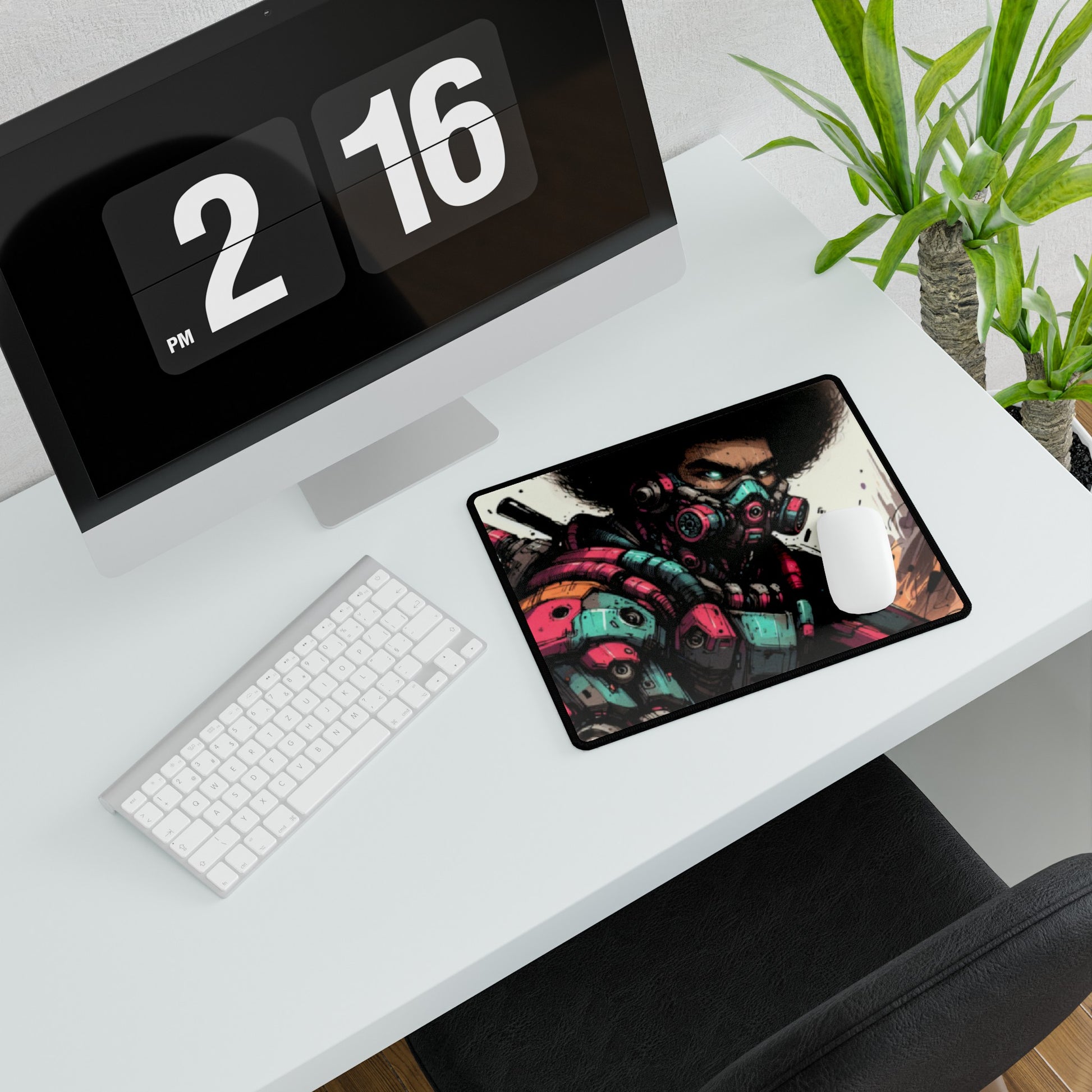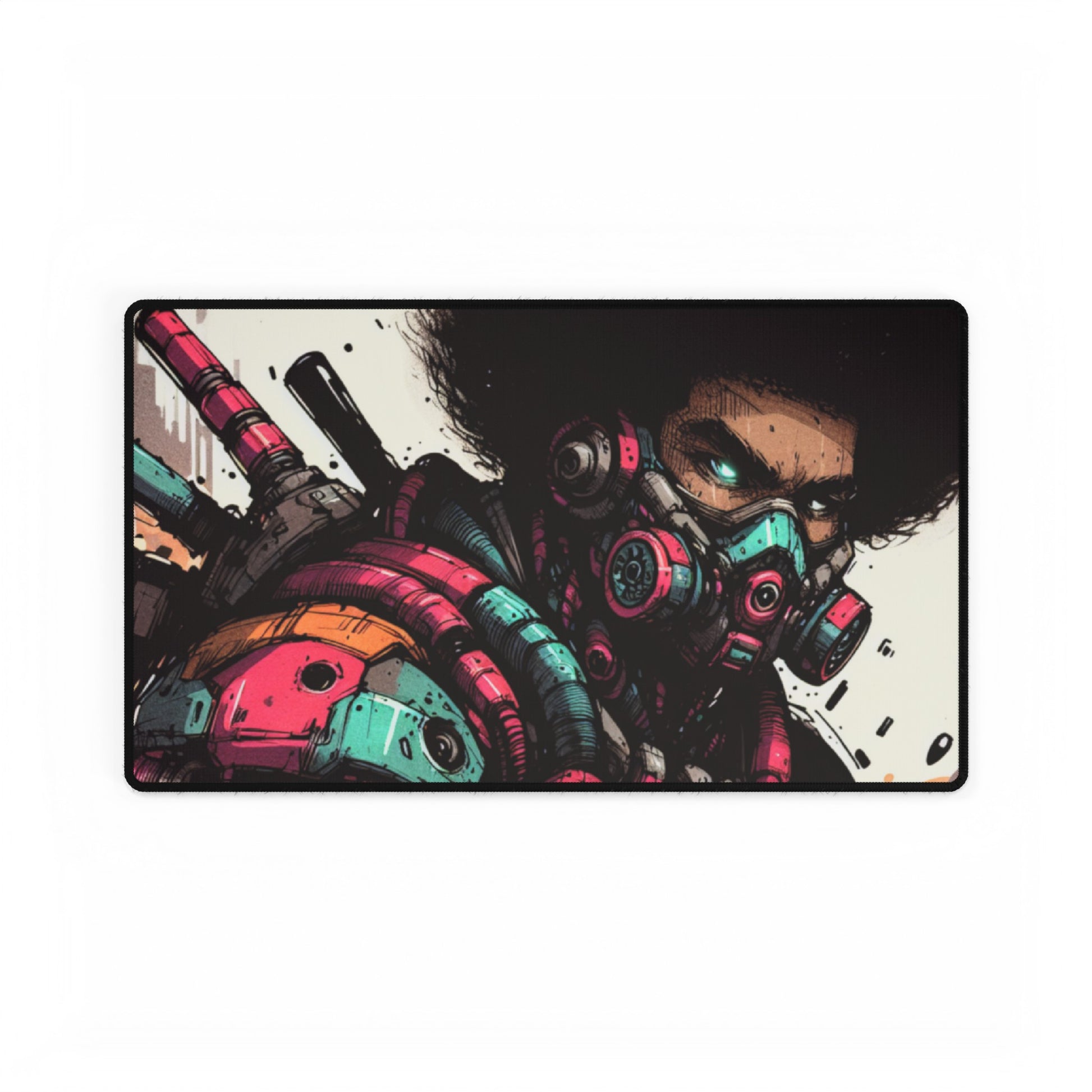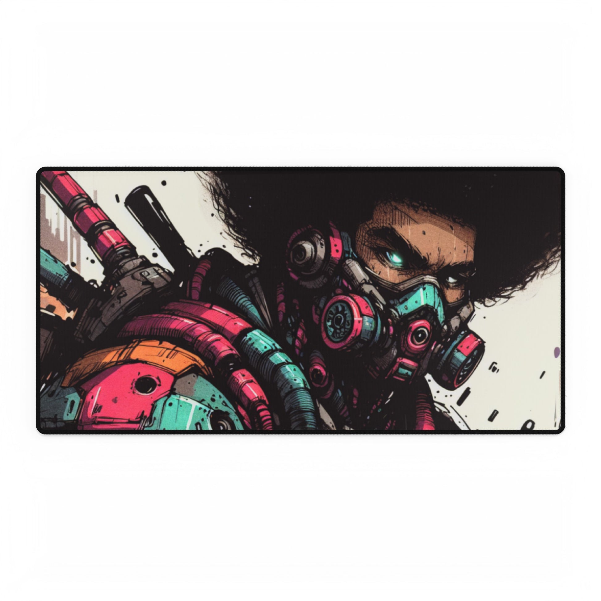 Get ready to dominate your workspace with the Apocalyptic Warzone Desk Mat, featuring a bold and futuristic Afro-punk character in the midst of a high-stakes battle, clad in vibrant mech gear.