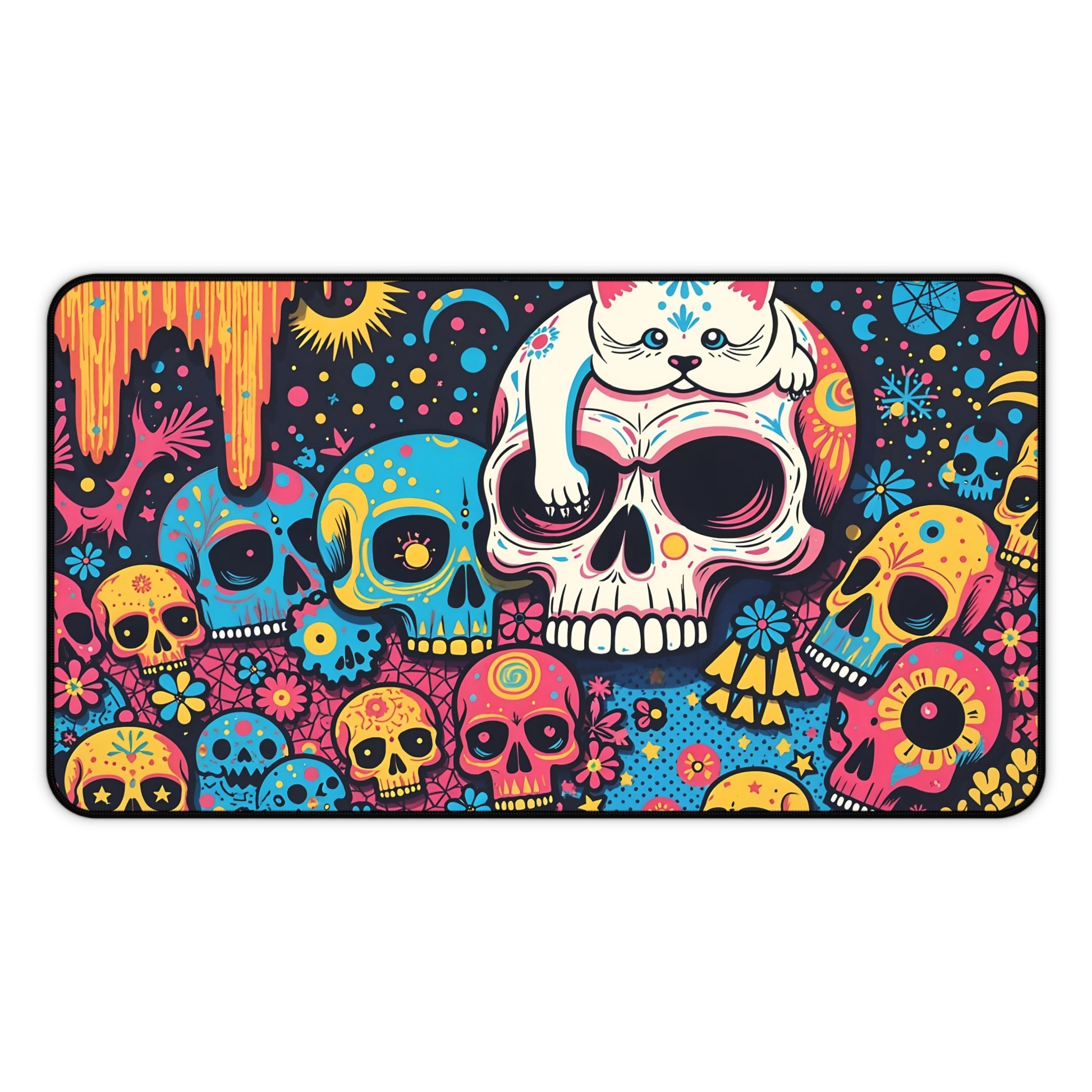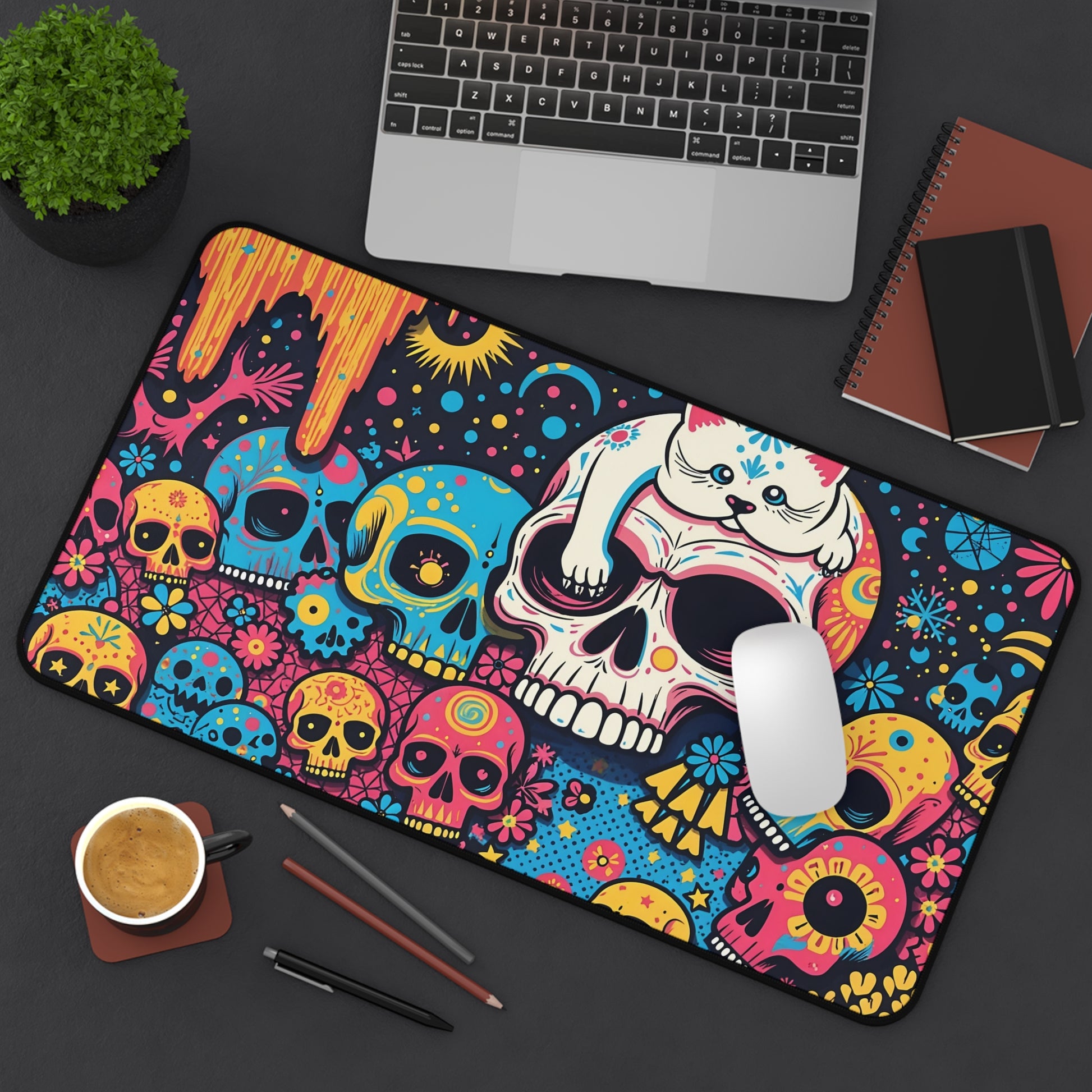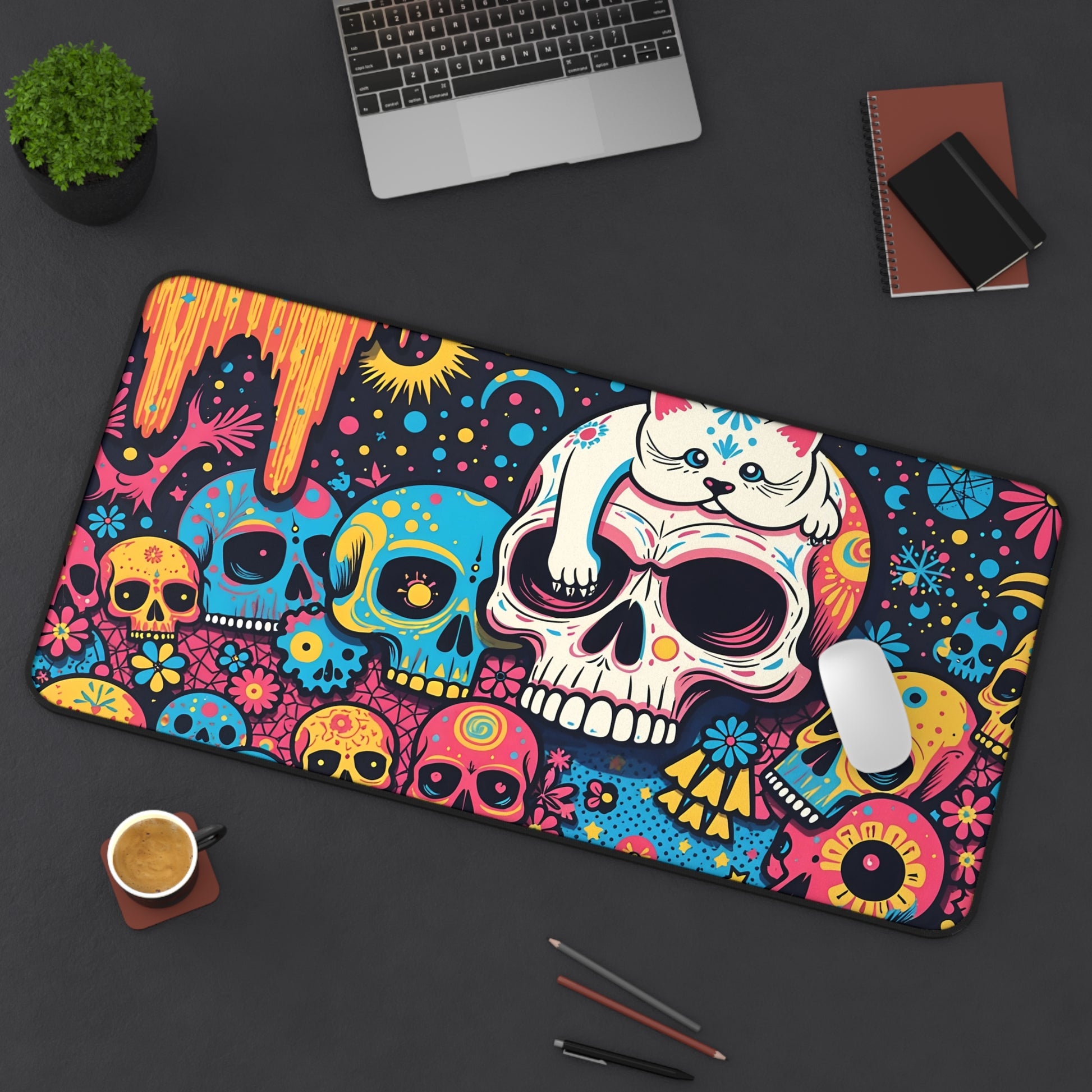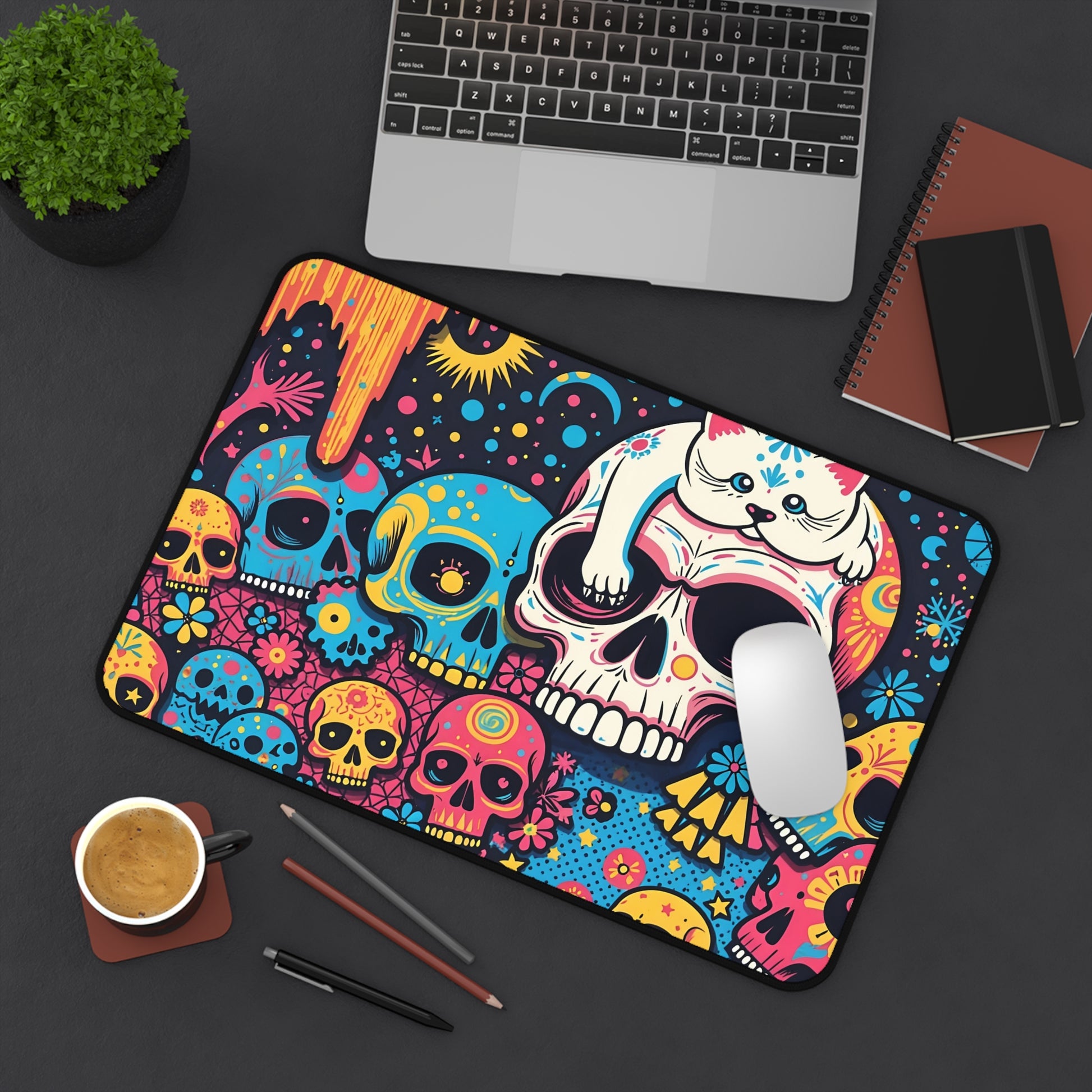 Perfect for gamers, artists, and fans of bold graphic design, this Vibrant Skull & Cat Mouse Pad brings a pop of color and personality to your space.