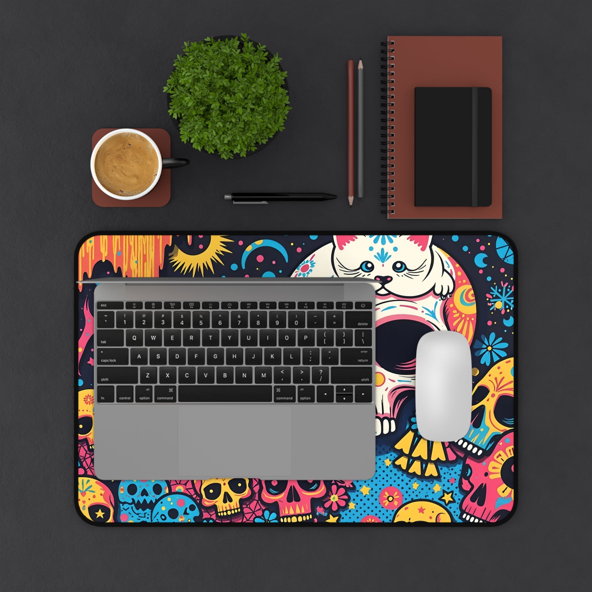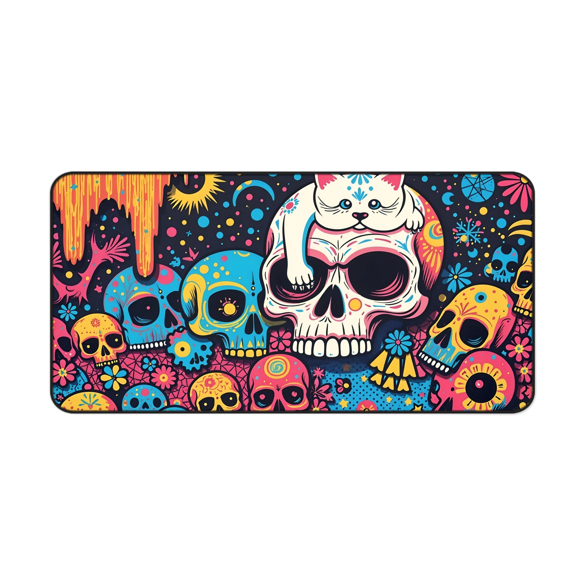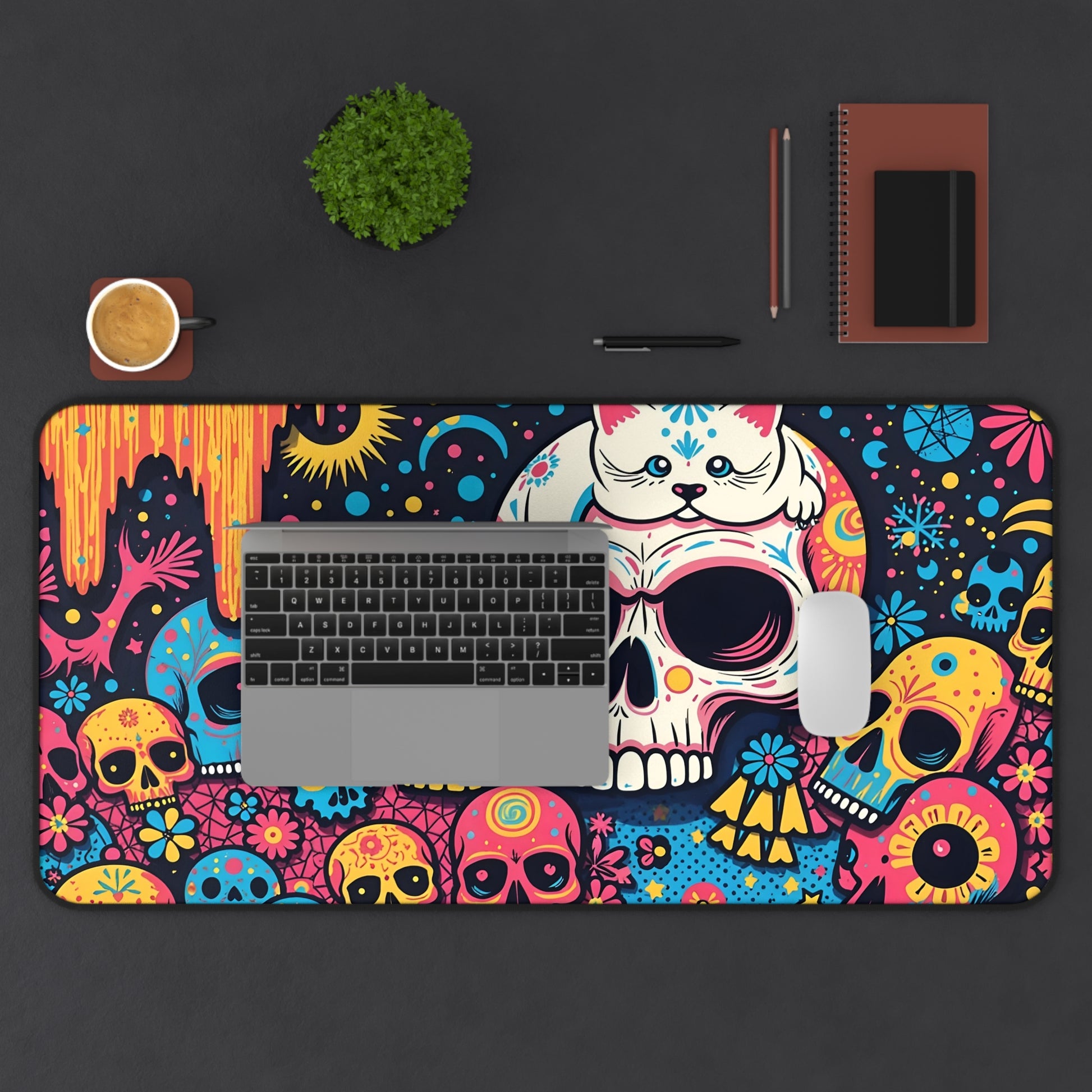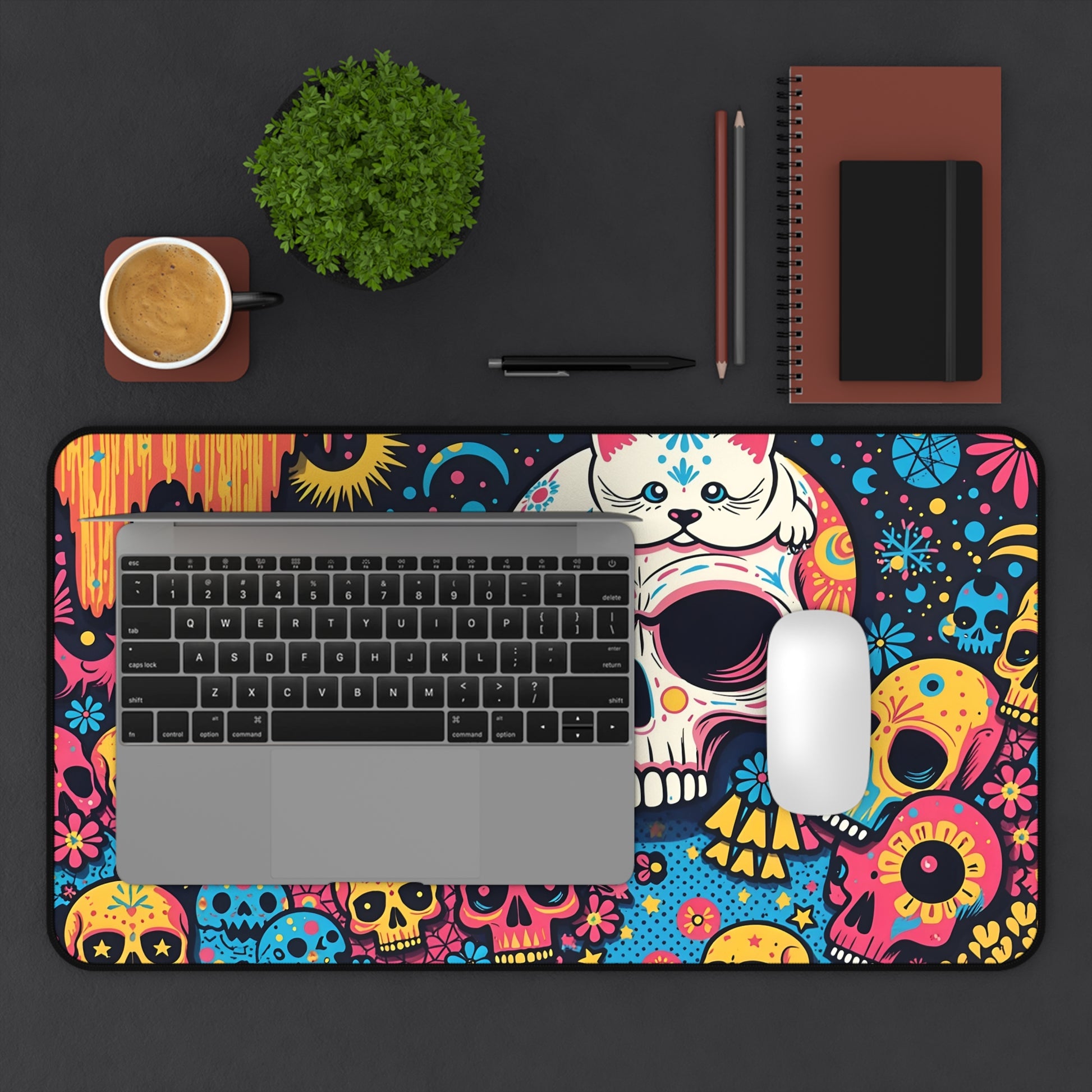 Perfect for gamers, artists, and fans of bold graphic design, this Vibrant Skull & Cat Mouse Pad brings a pop of color and personality to your space.