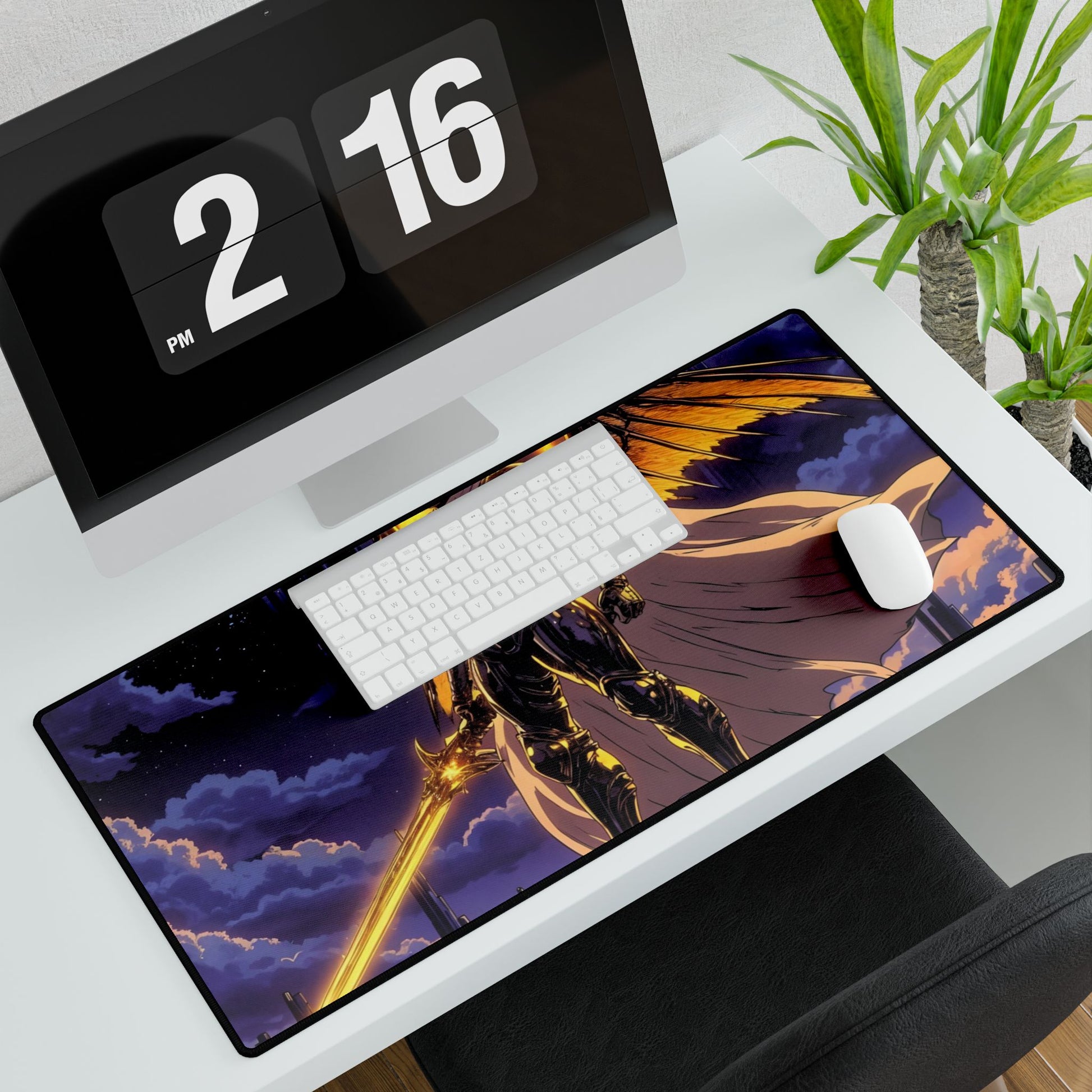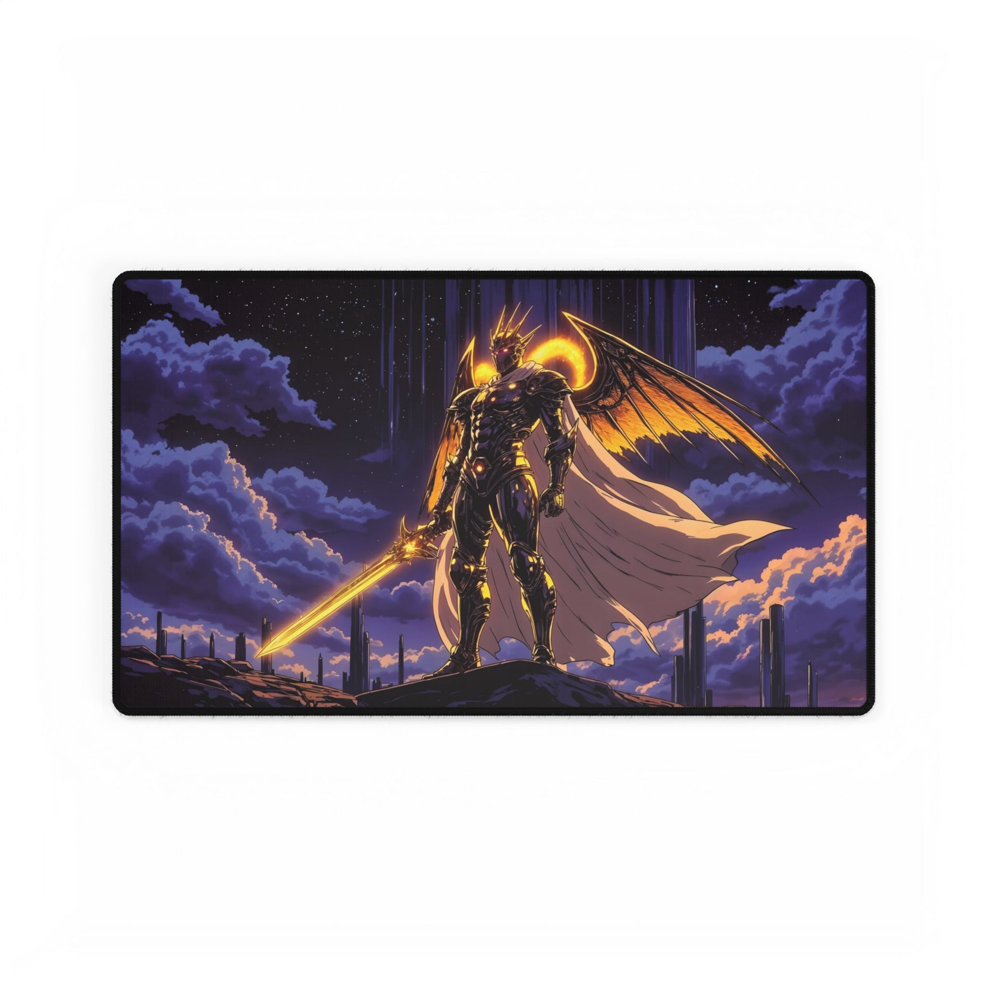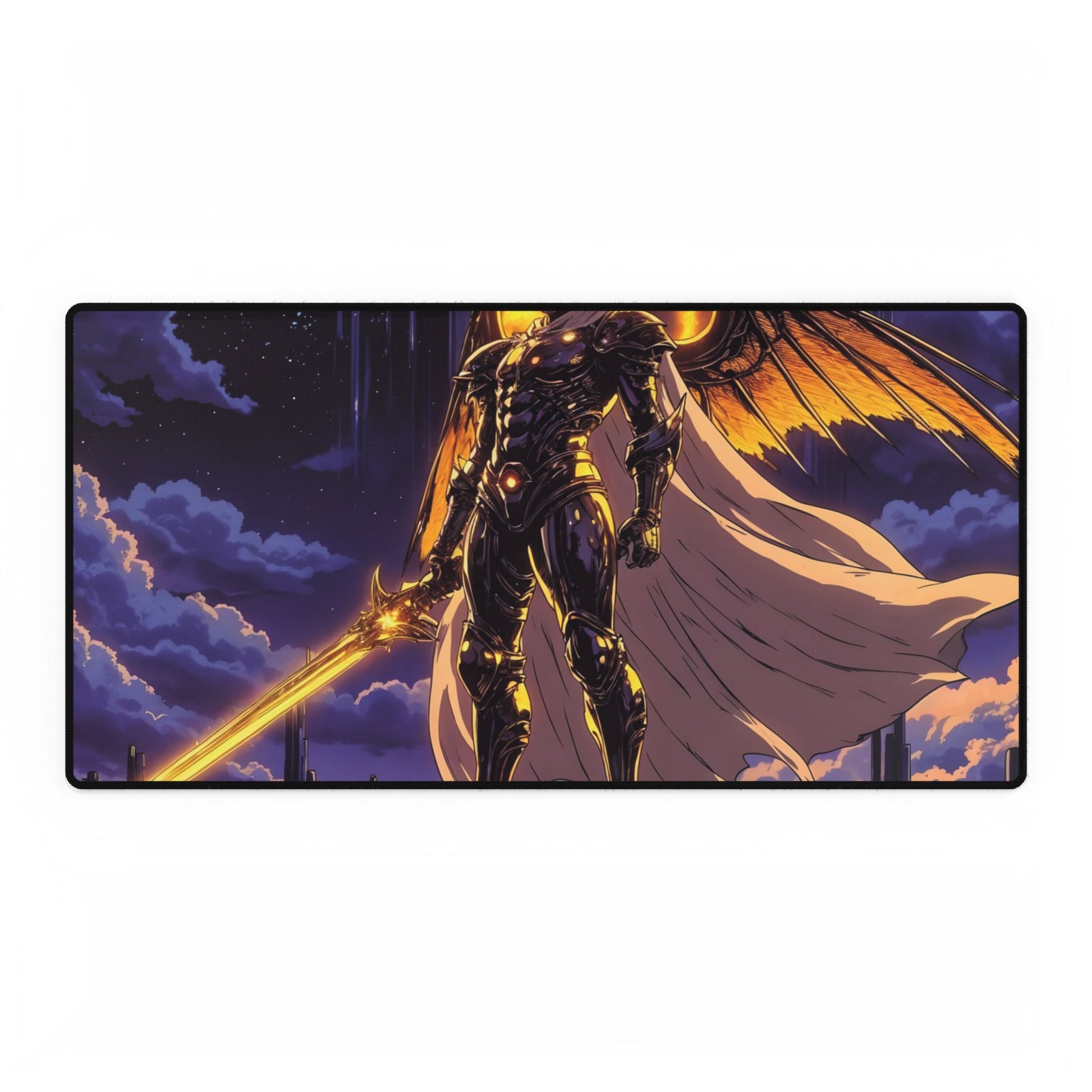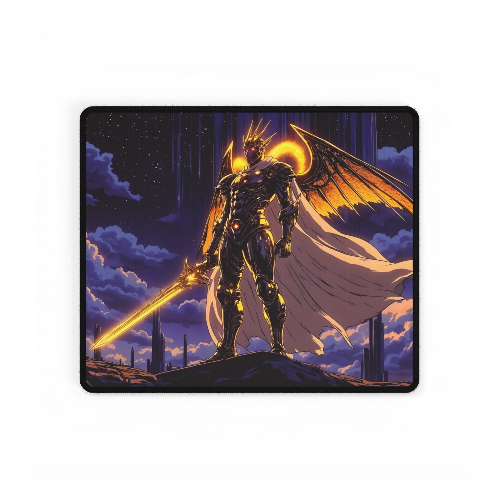 A legendary battlefield unfolds on this stunning anime-inspired gaming mouse pad, featuring a Celestial Warrior of Light standing atop the ruins of an ancient floating temple, bathed in divine energy. Clad in golden armor etched with glowing celestial runes, this towering warrior exudes power, with a flaming double-edged sword in one hand and a shimmering constellation shield in the other. A halo of golden light surrounds their head, while a billowing ethereal cape made of starlight flows behind them.