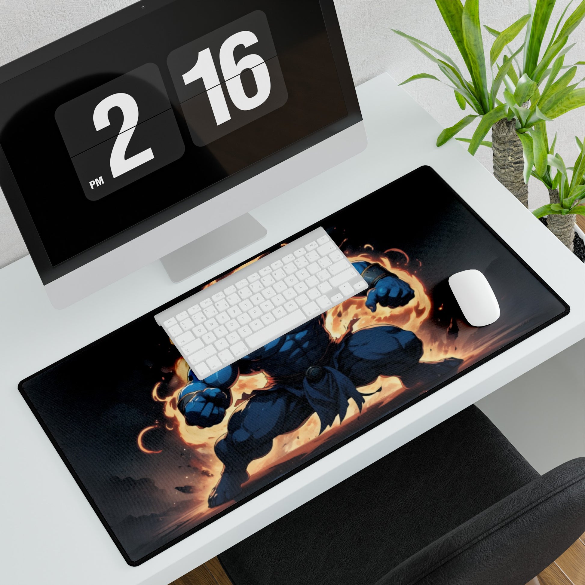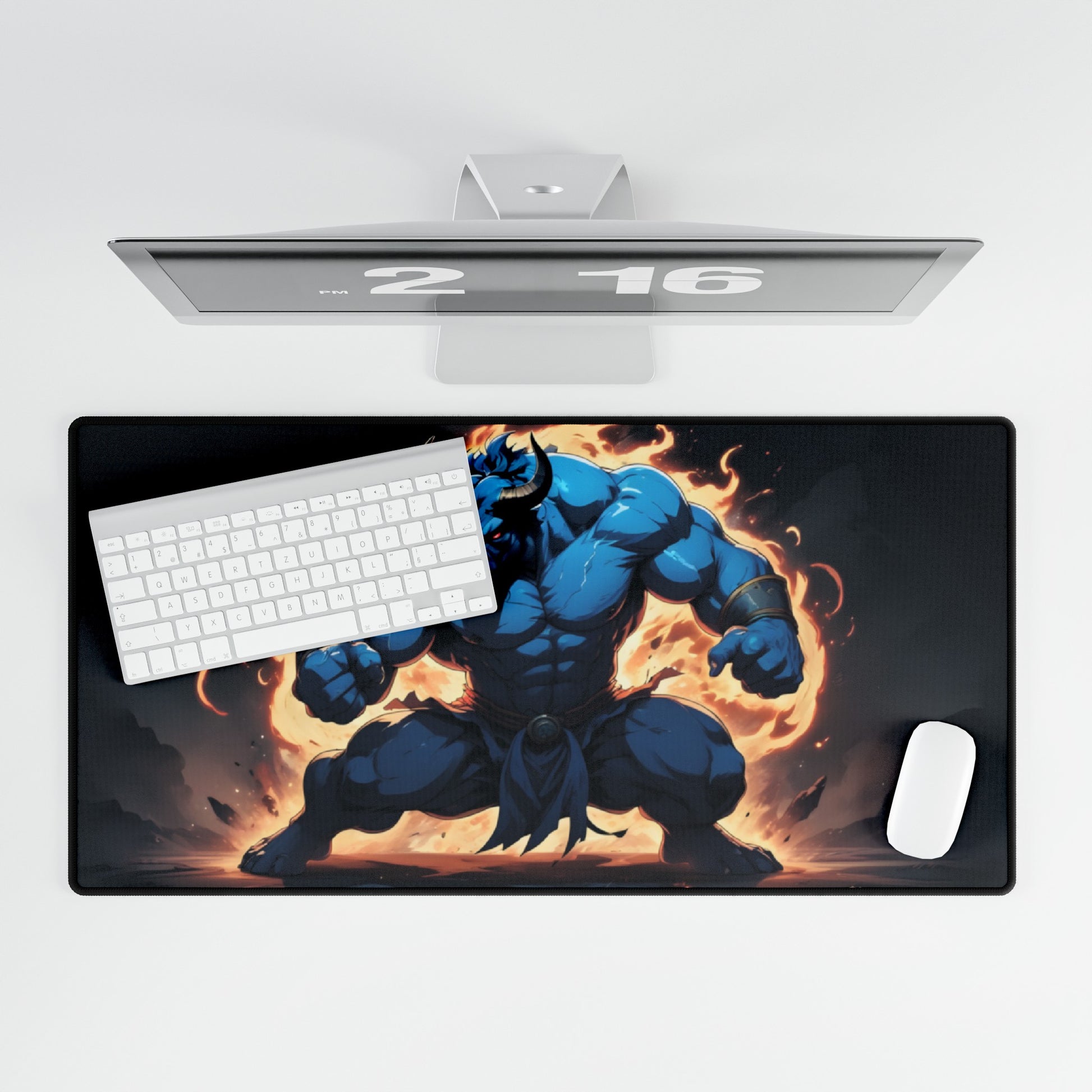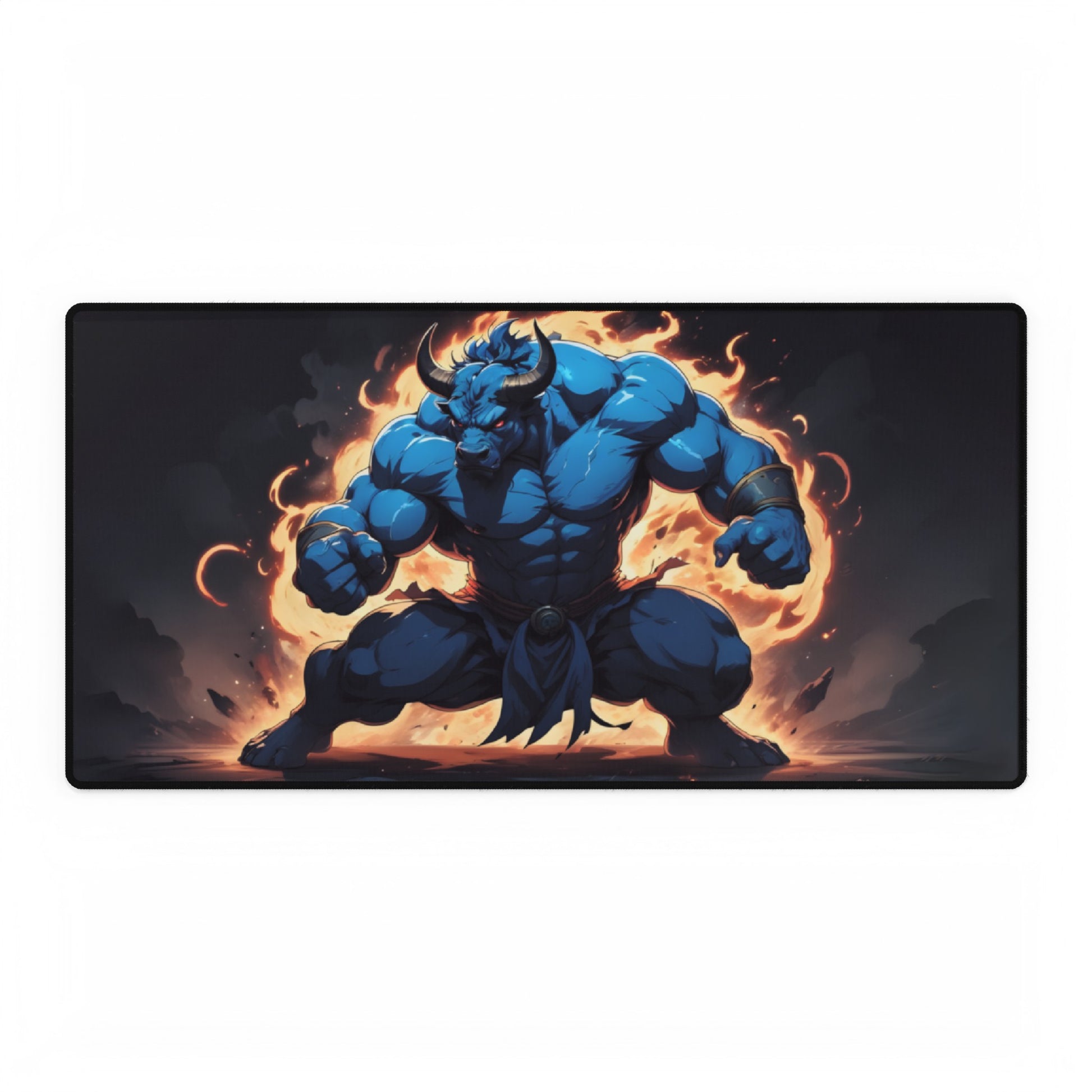 Add a touch of boldness to your workspace with the Raging Bull Desk Mat and Mouse Pad! This dynamic desk mat is designed to make a statement, featuring an animated comic-styled blue raging bull set against a fiery backdrop. The vibrant design is sure to ignite your productivity and add a burst of energy to your daily routine. The desk mat provides a smooth, durable surface for your keyboard and mouse to glide across, while the mouse pad offers precision tracking and control. Make a powerful statement with your workspace decor and unleash your inner "bull" with this unique and eye-catching desk accessory set.