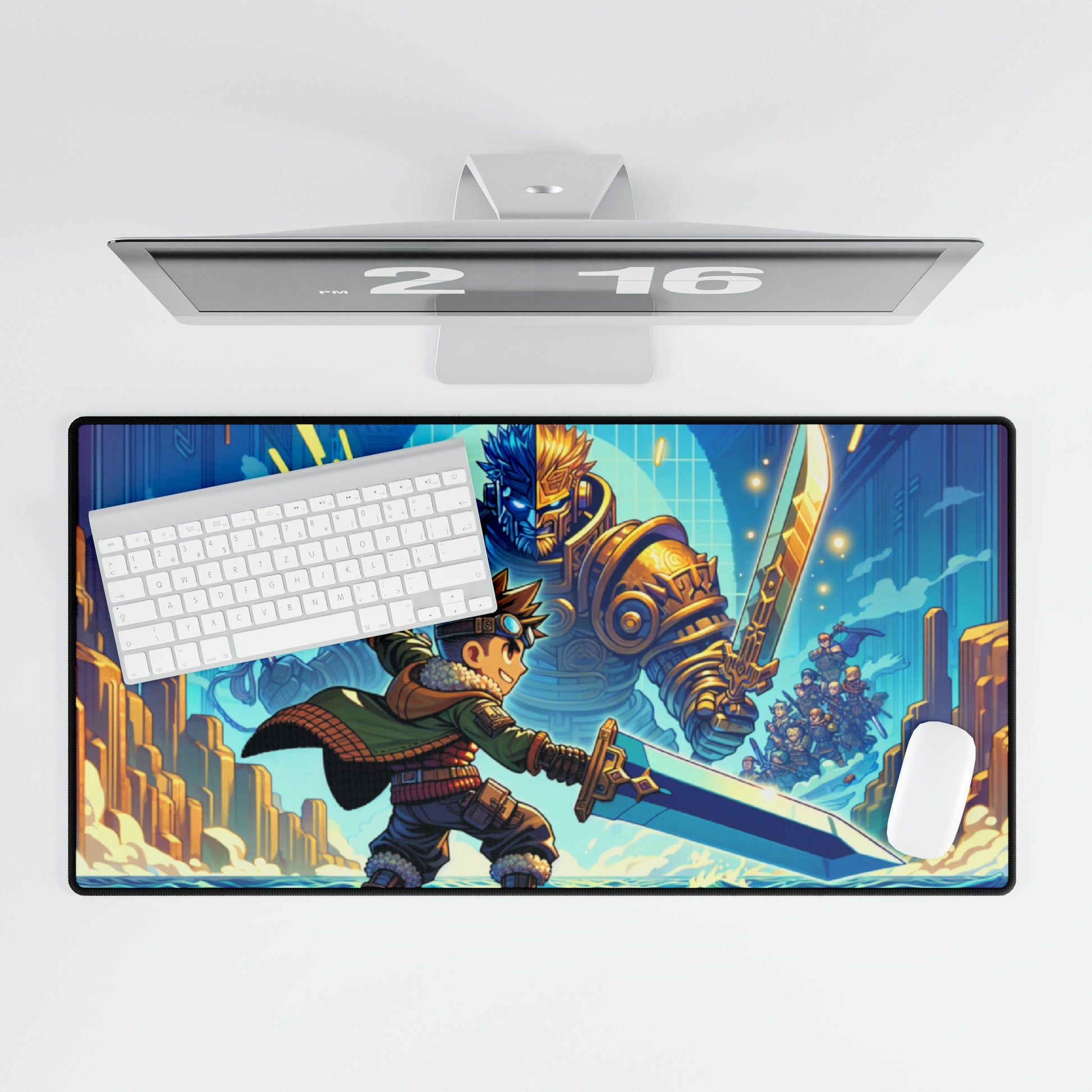 Get ready to conquer your workspace with the Final Boss Desk Mat and Mouse Pad! This epic accessory features an exhilarating illustration of a brave warrior from an RPG video game, standing tall with a mighty sword in hand, ready to face off against the ultimate foe. The dramatic design shows the hero's back, with the final boss looming large in the foreground, set against a stunning ocean backdrop. The close-up detail brings the action to life, immersing you in the thrill of the battle. Made from high-quality materials, this desk mat and mouse pad combo provides a smooth, precise tracking surface for your mouse, while the desk mat protects your workspace from spills, scratches, and scuffs. The vibrant, colorful design adds a touch of excitement to your daily routine, inspiring you to tackle even the toughest challenges with confidence. Whether you're a gamer, a fan of fantasy, or simply someone who loves a good battle, this Final Boss Desk Mat and Mouse Pad is the ultimate accessory for your workspace.