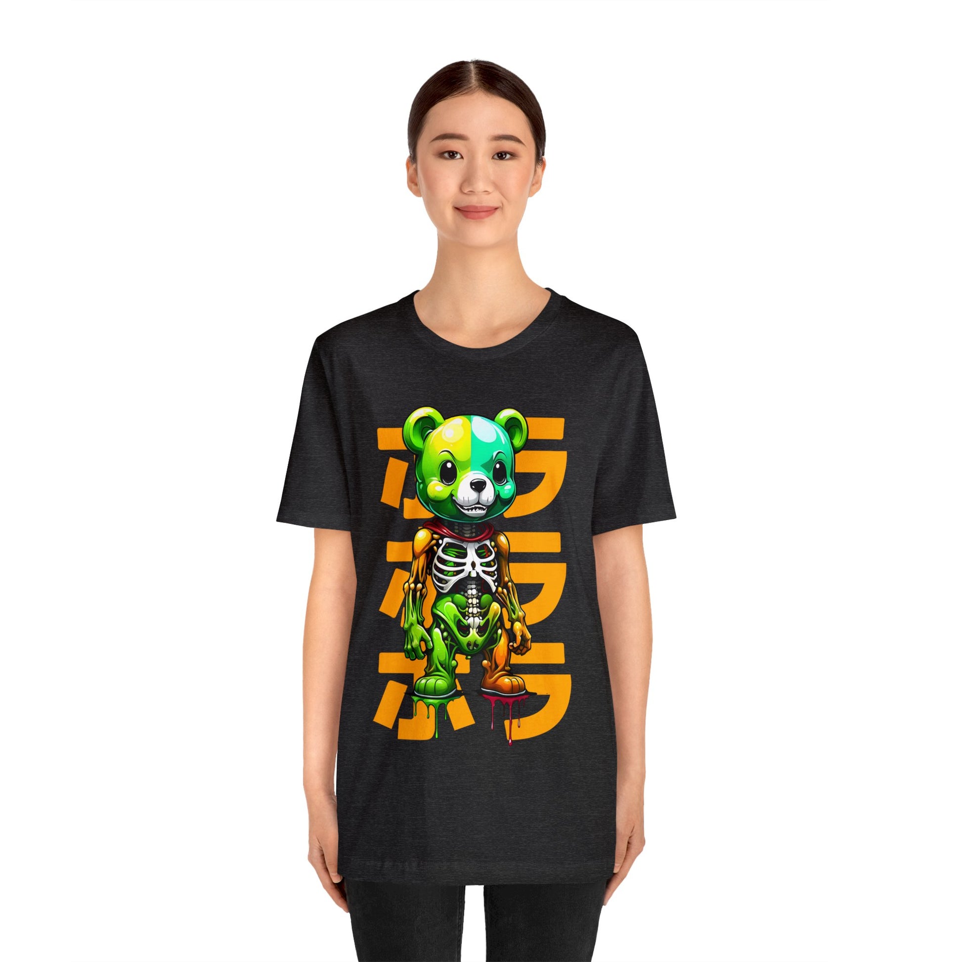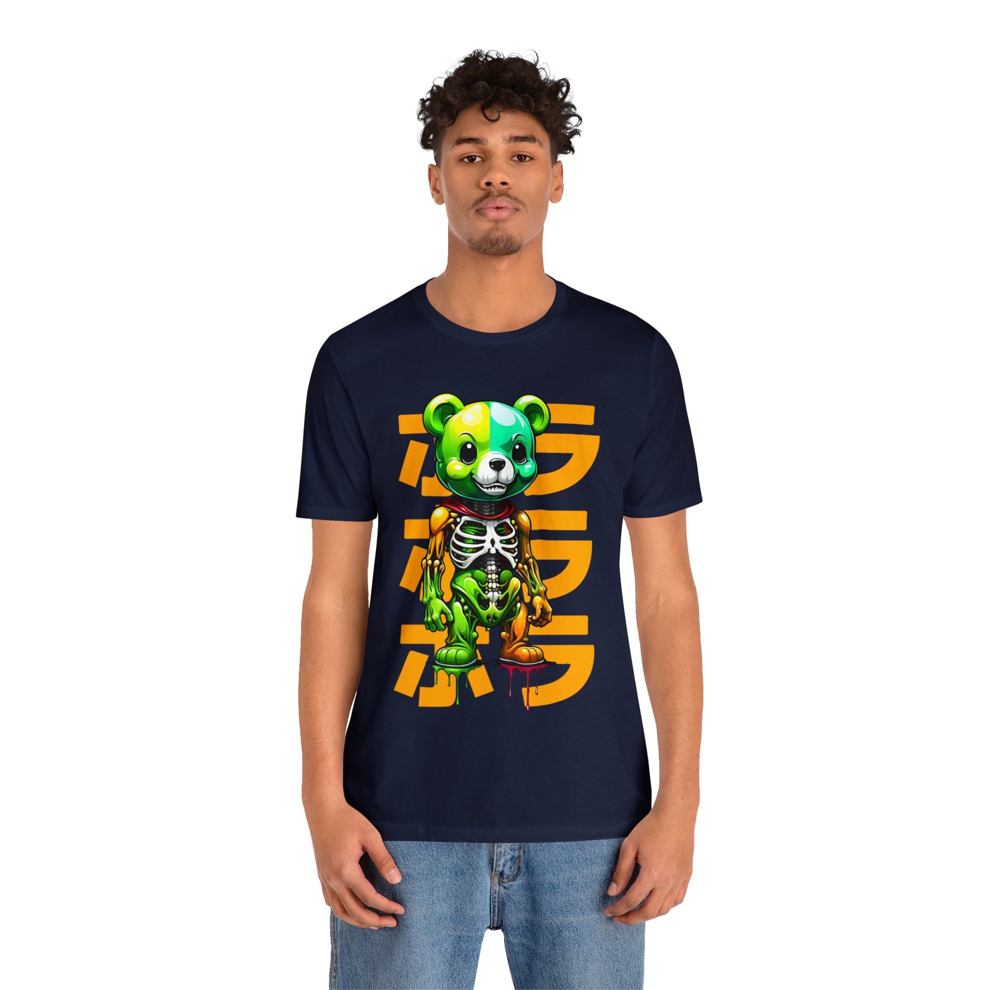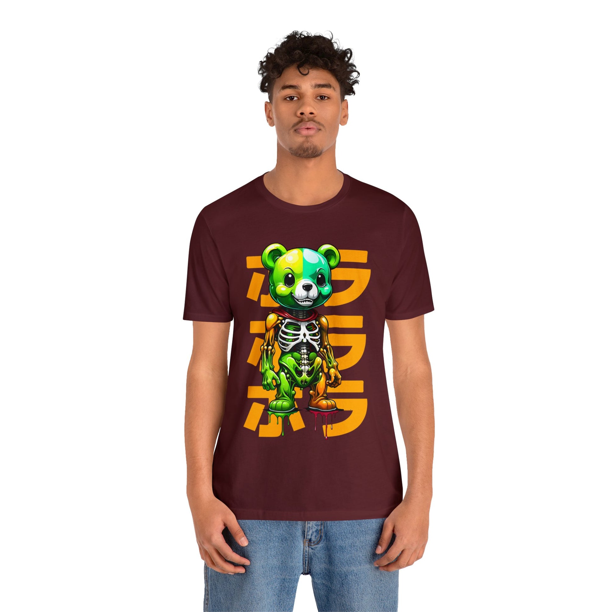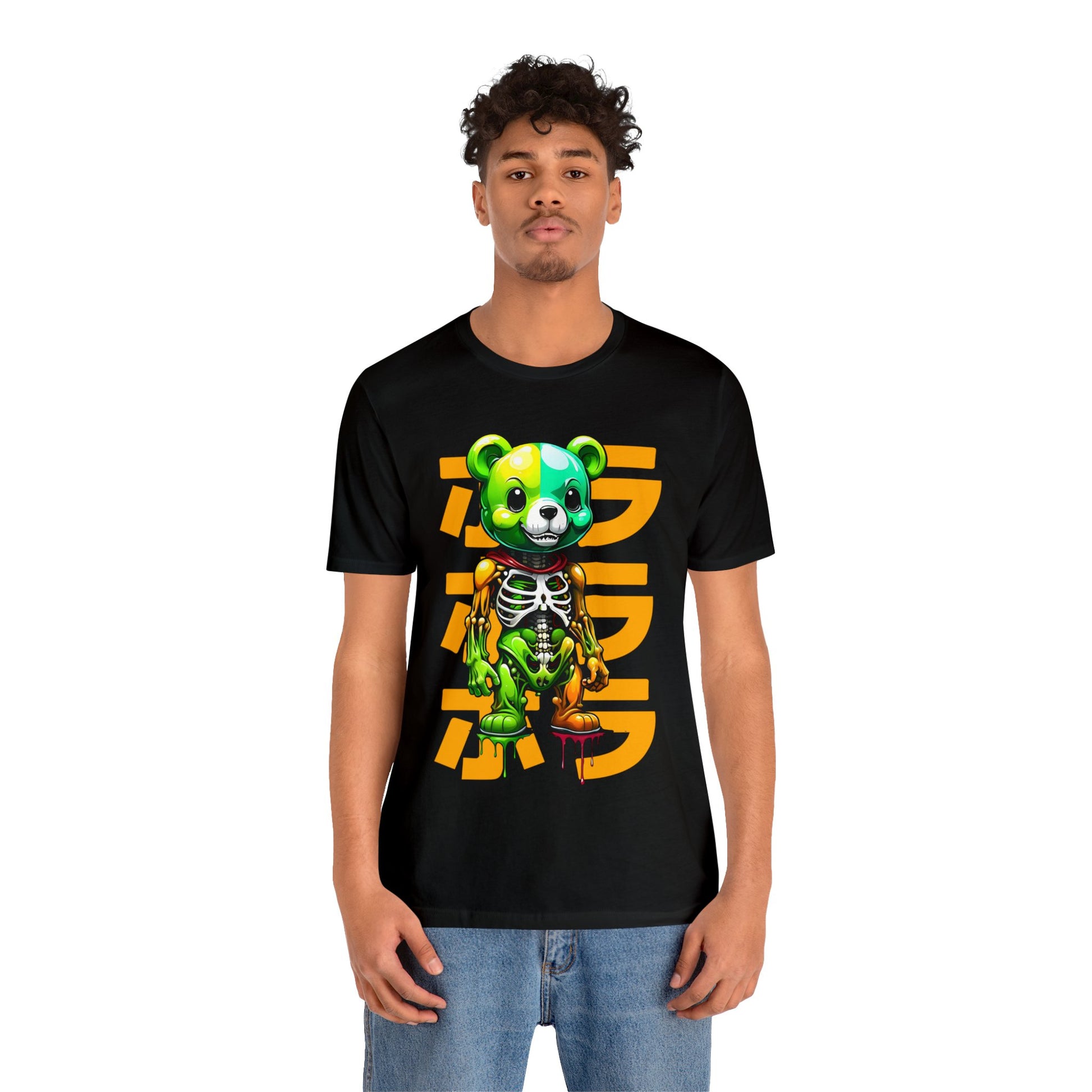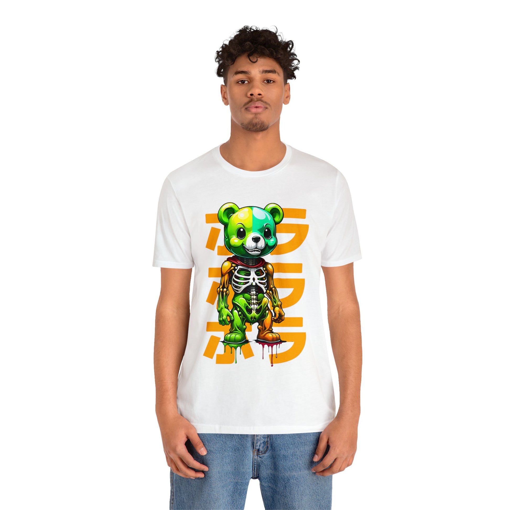 Revitalize your wardrobe with our Gummy Bear Zombie Skeleton T-Shirt. This vibrant shirt combines quirky aesthetics with comfort, featuring: