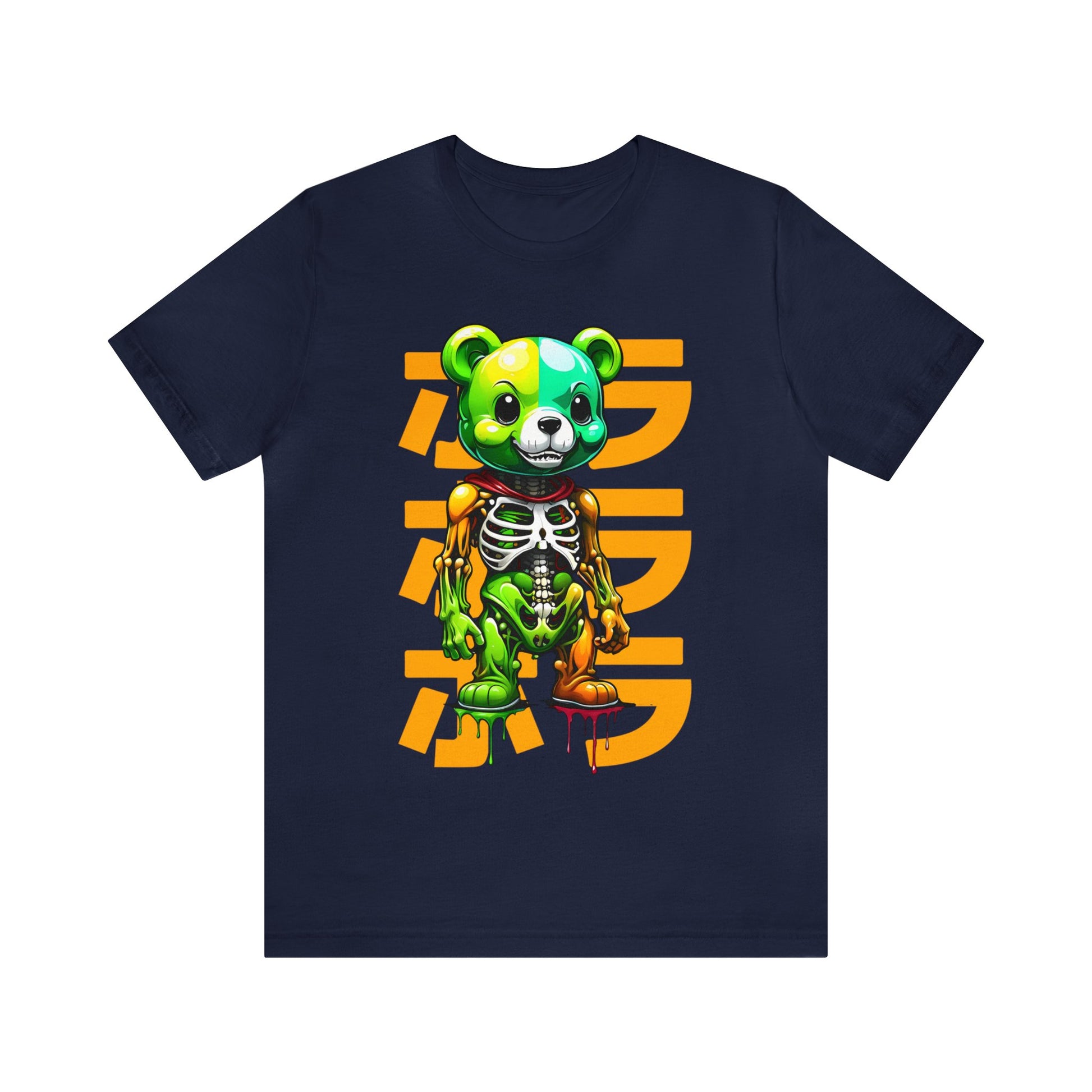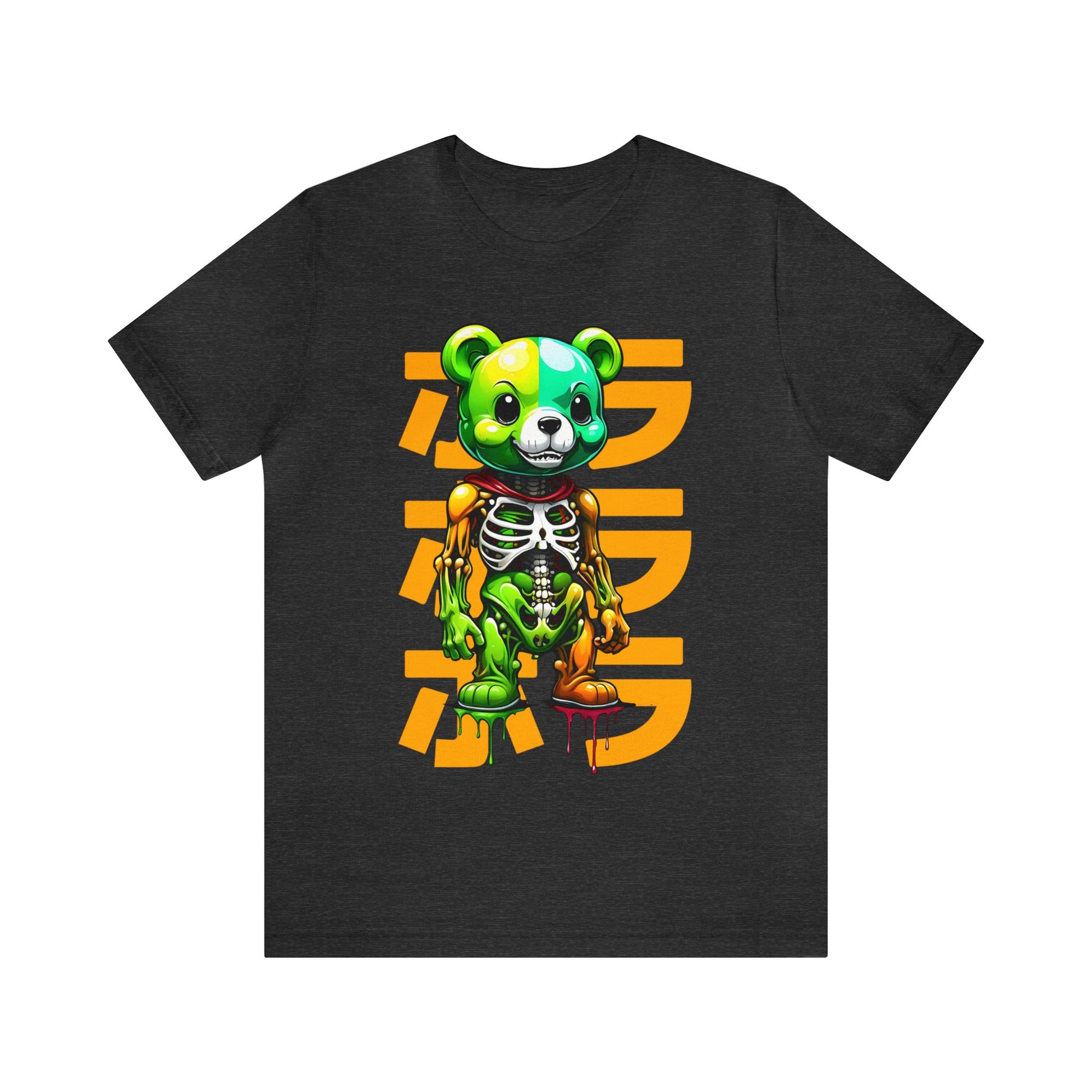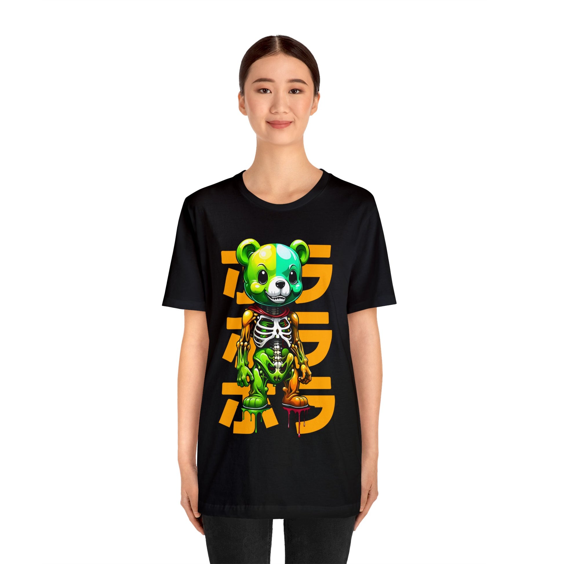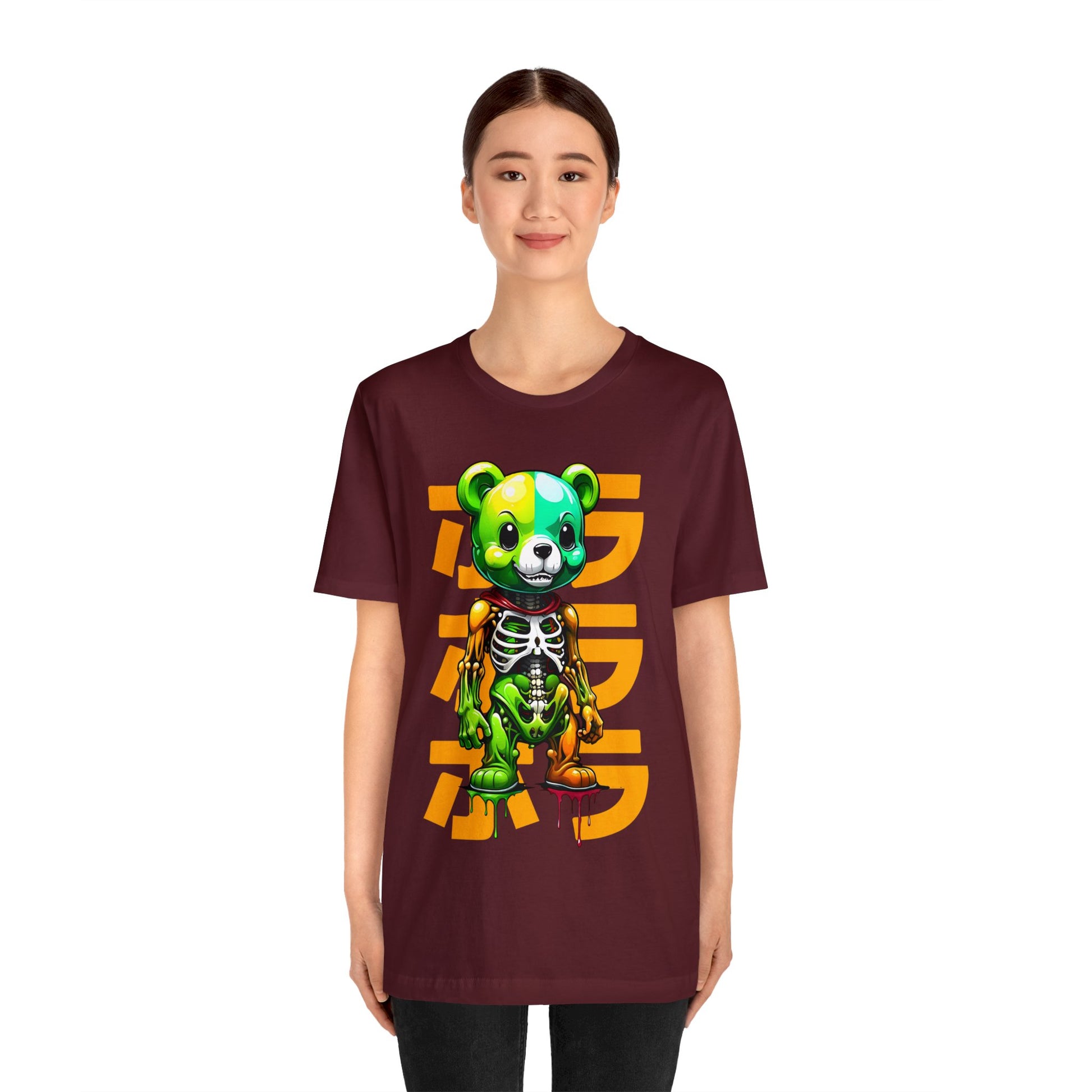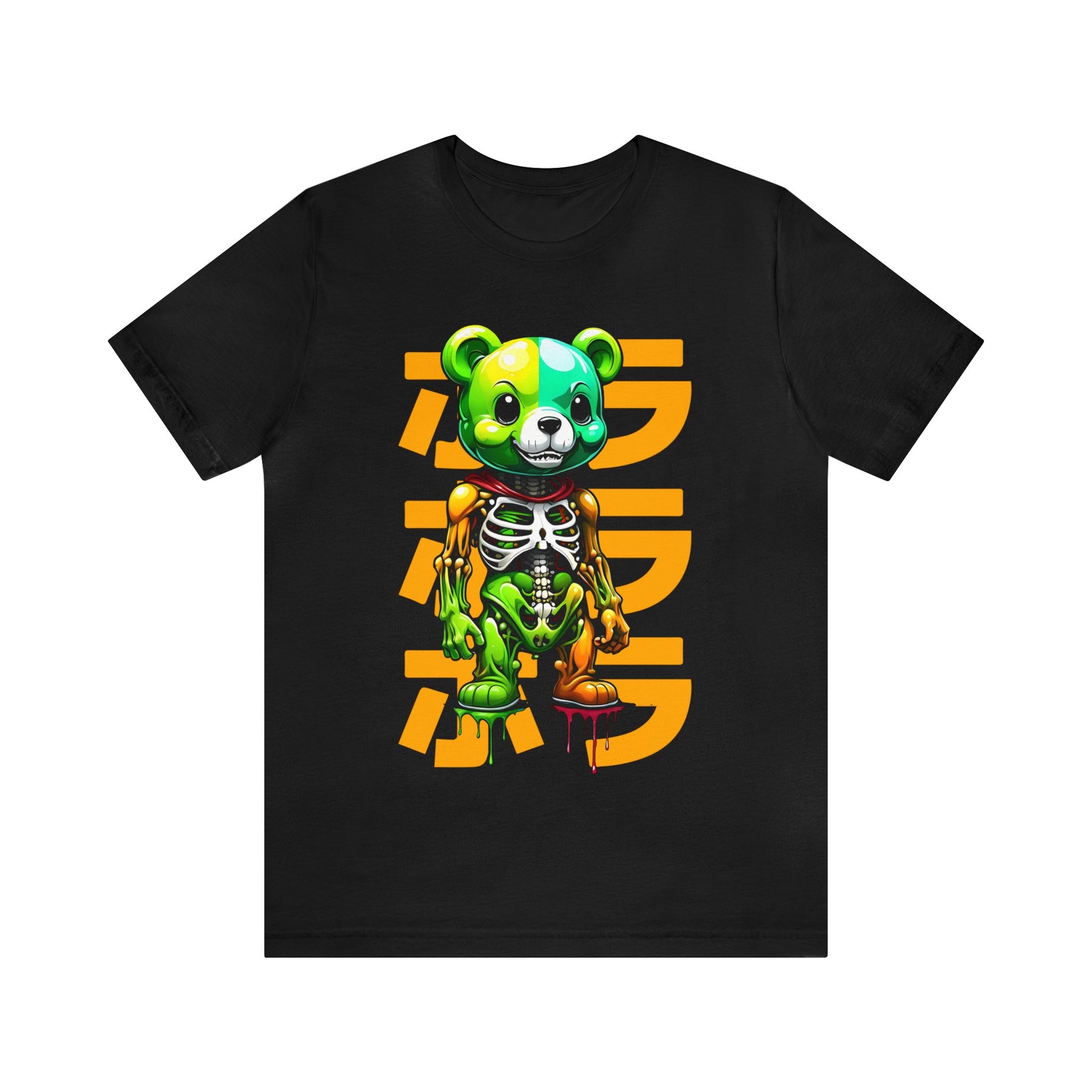 Revitalize your wardrobe with our Gummy Bear Zombie Skeleton T-Shirt. This vibrant shirt combines quirky aesthetics with comfort, featuring: