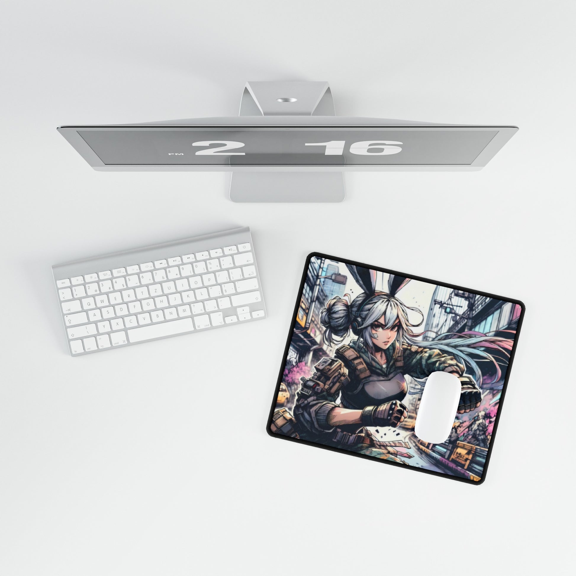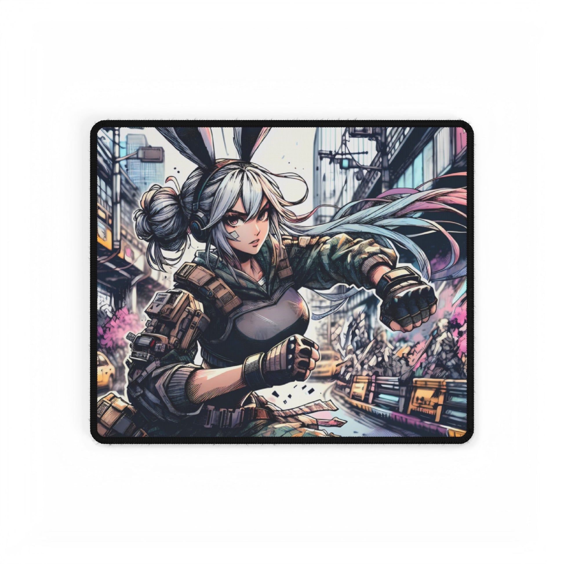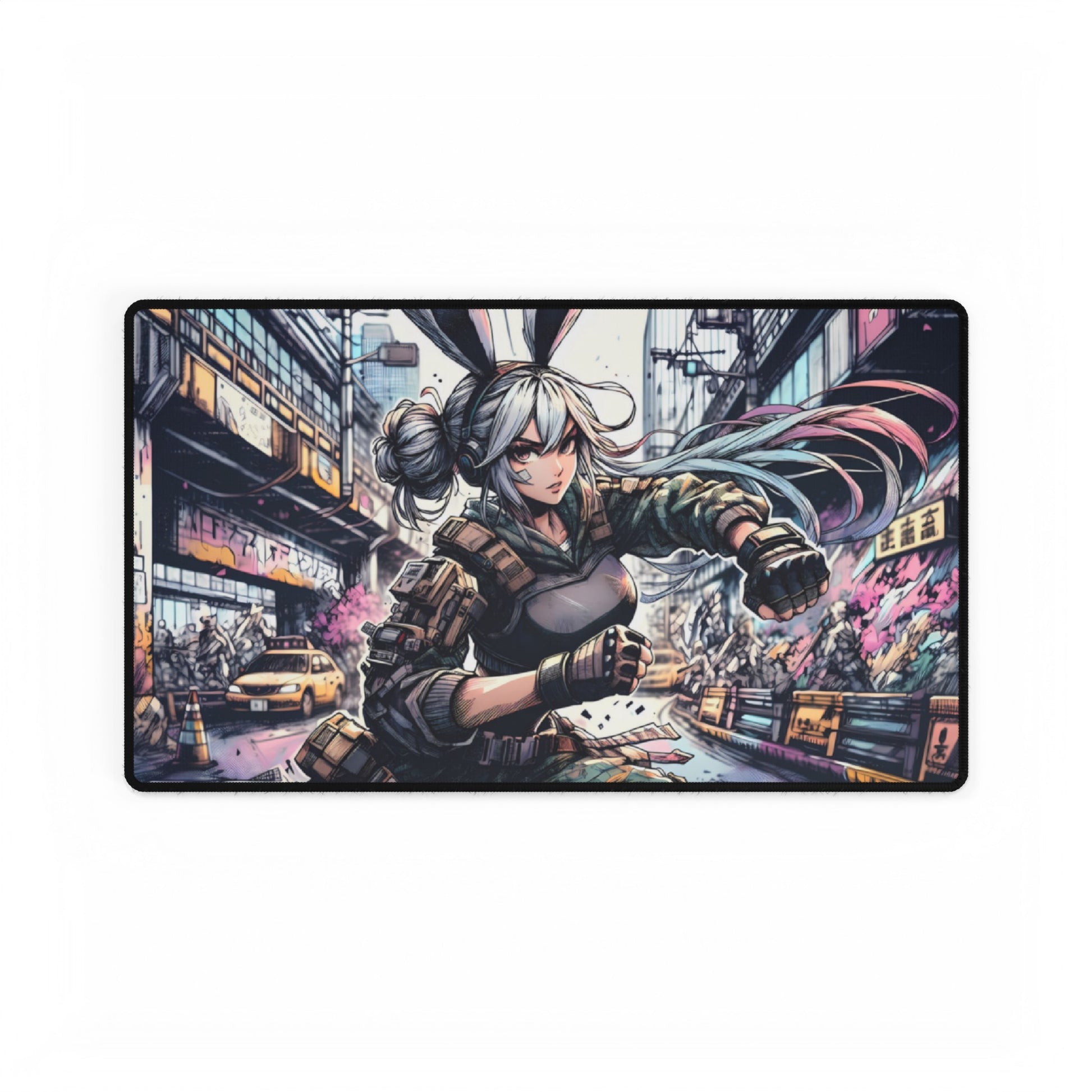 Get ready to level up your workspace with the Mad Rabbit Street Fighter Desk Mat! This vibrant and eye-catching accessory features a stunning female street fighter, donning bunny ears, in the midst of an action-packed battle scene set against the backdrop of Tokyo's streets. The unique sci-fi design is sure to add a touch of excitement to your daily routine.