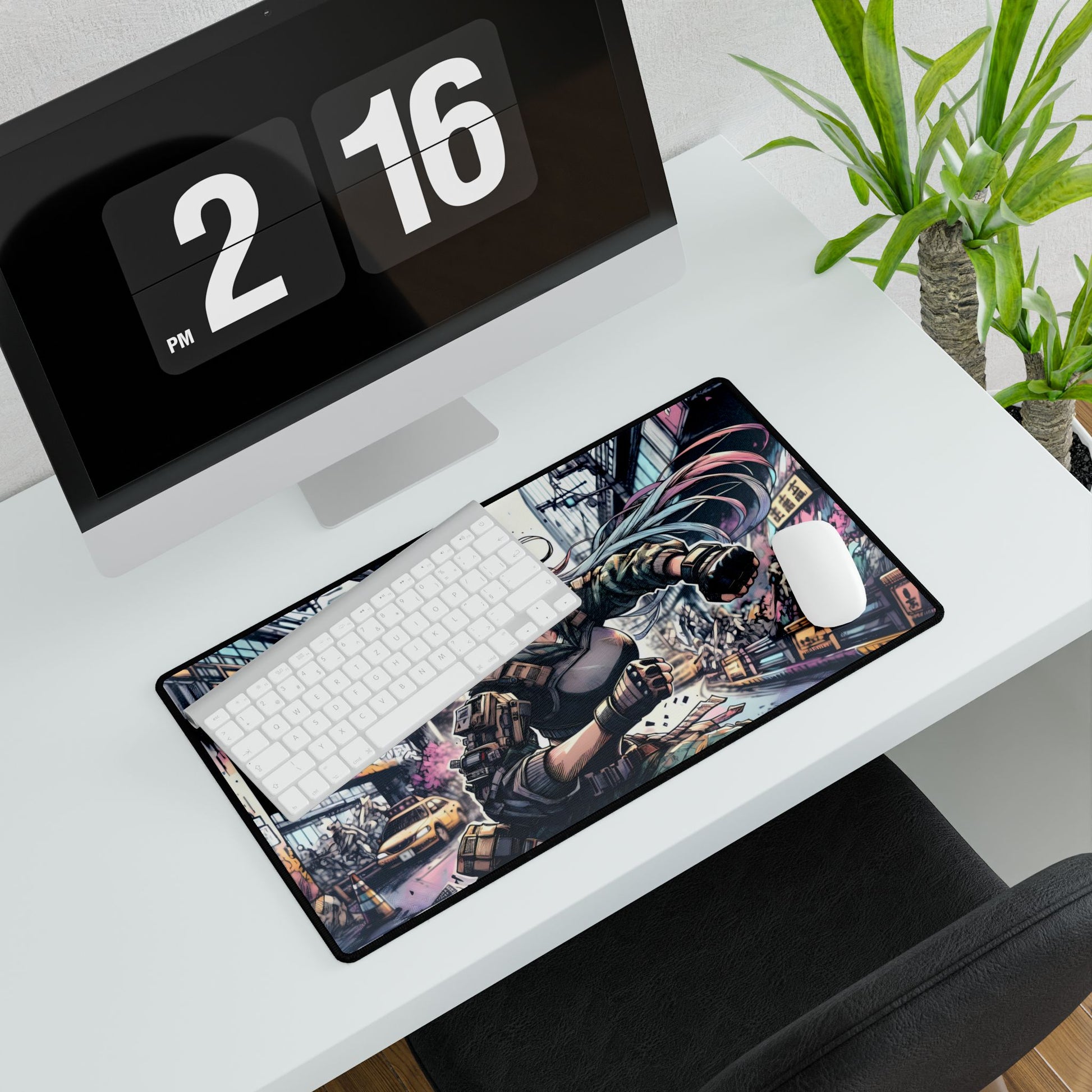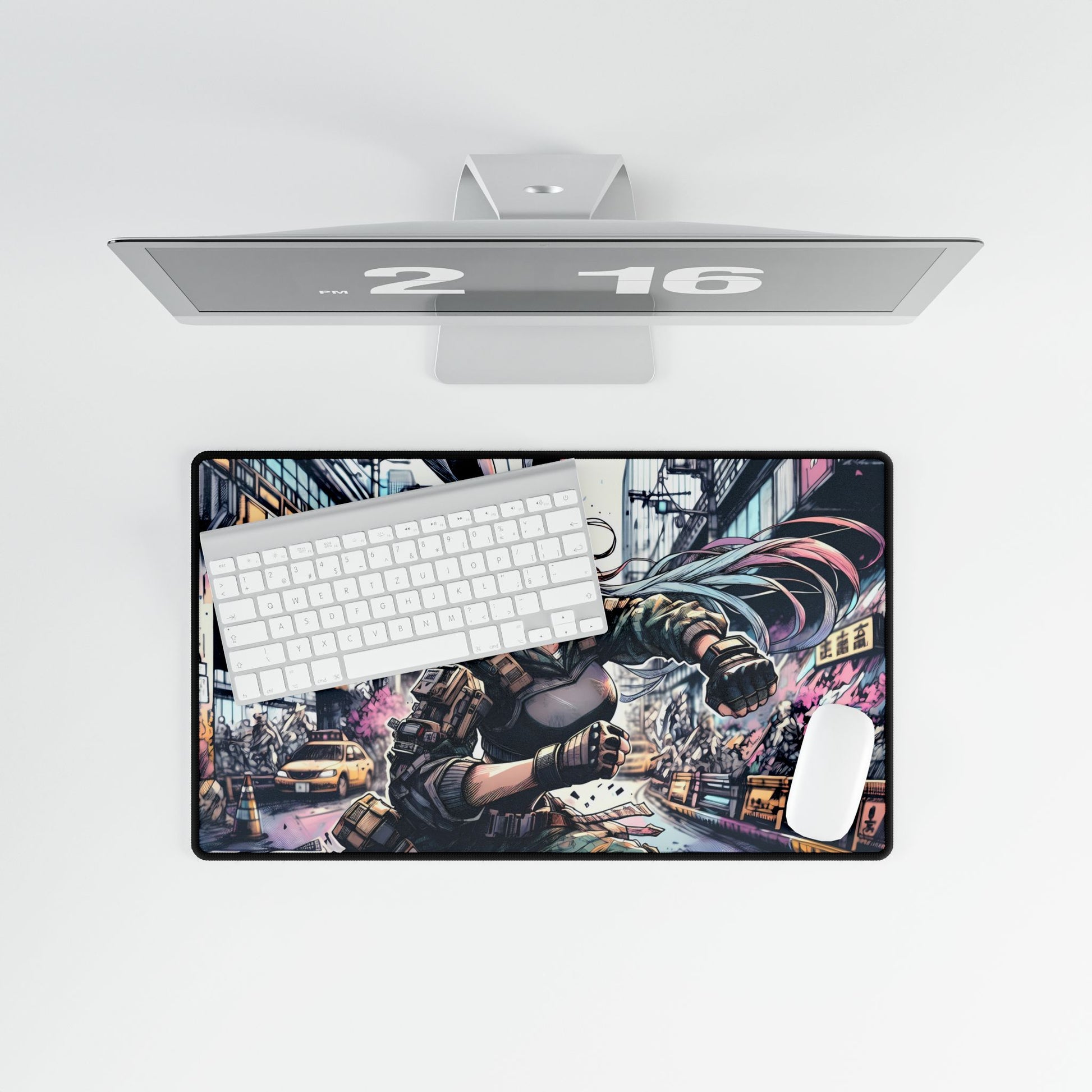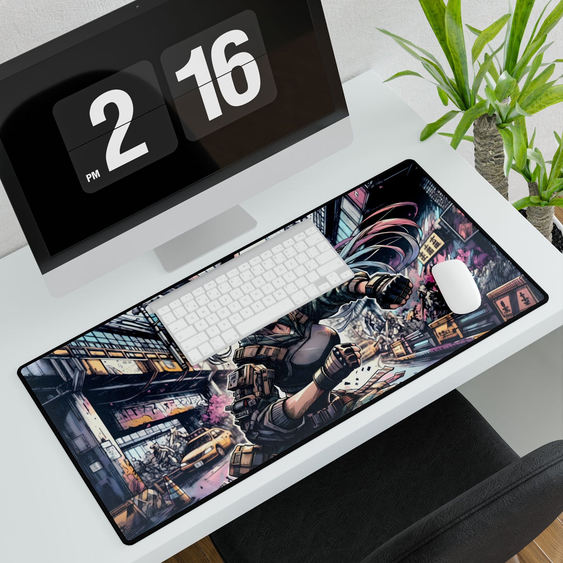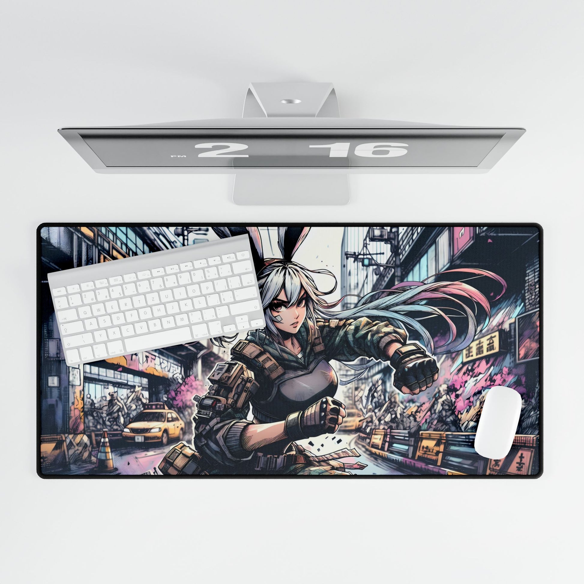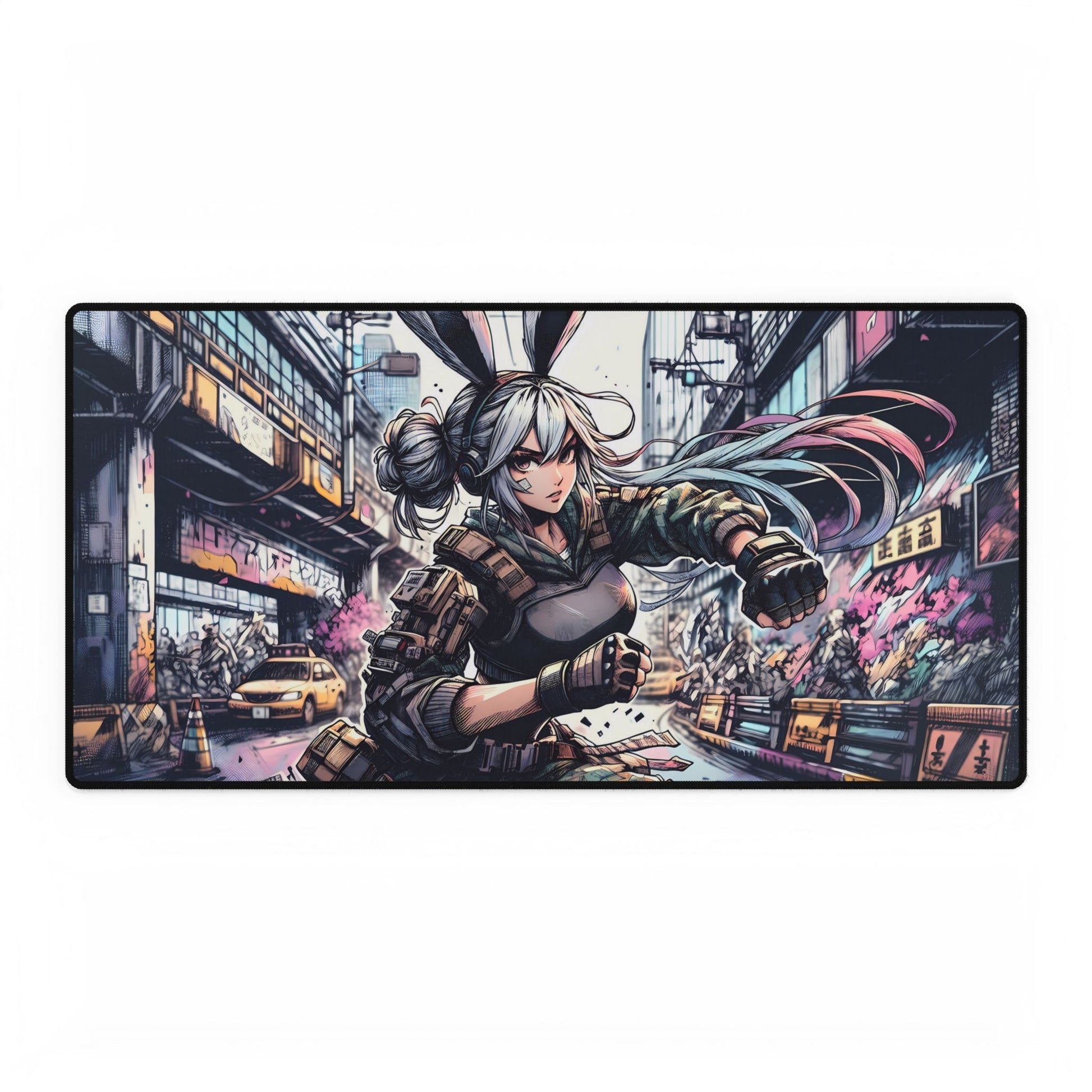 Get ready to level up your workspace with the Mad Rabbit Street Fighter Desk Mat! This vibrant and eye-catching accessory features a stunning female street fighter, donning bunny ears, in the midst of an action-packed battle scene set against the backdrop of Tokyo's streets. The unique sci-fi design is sure to add a touch of excitement to your daily routine.