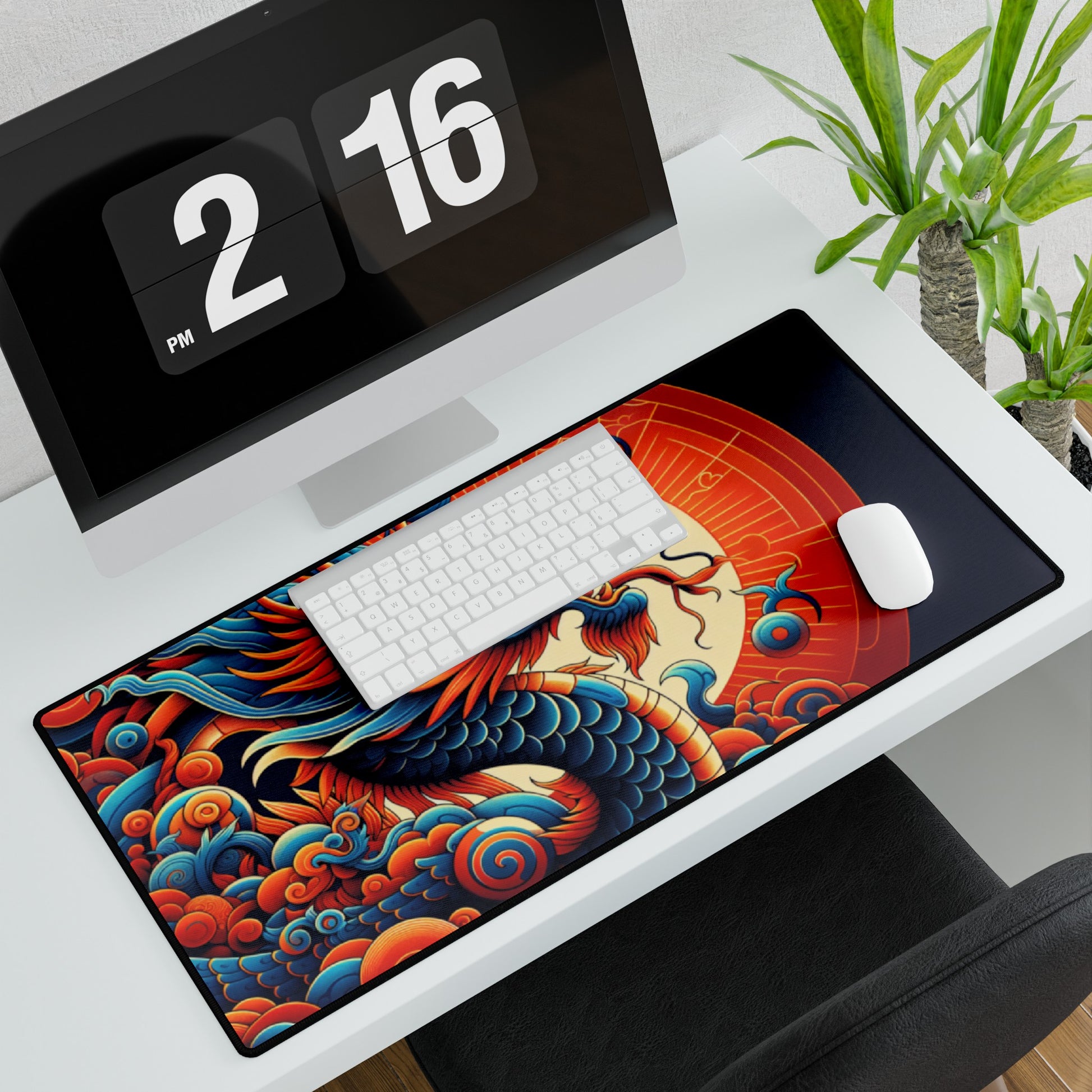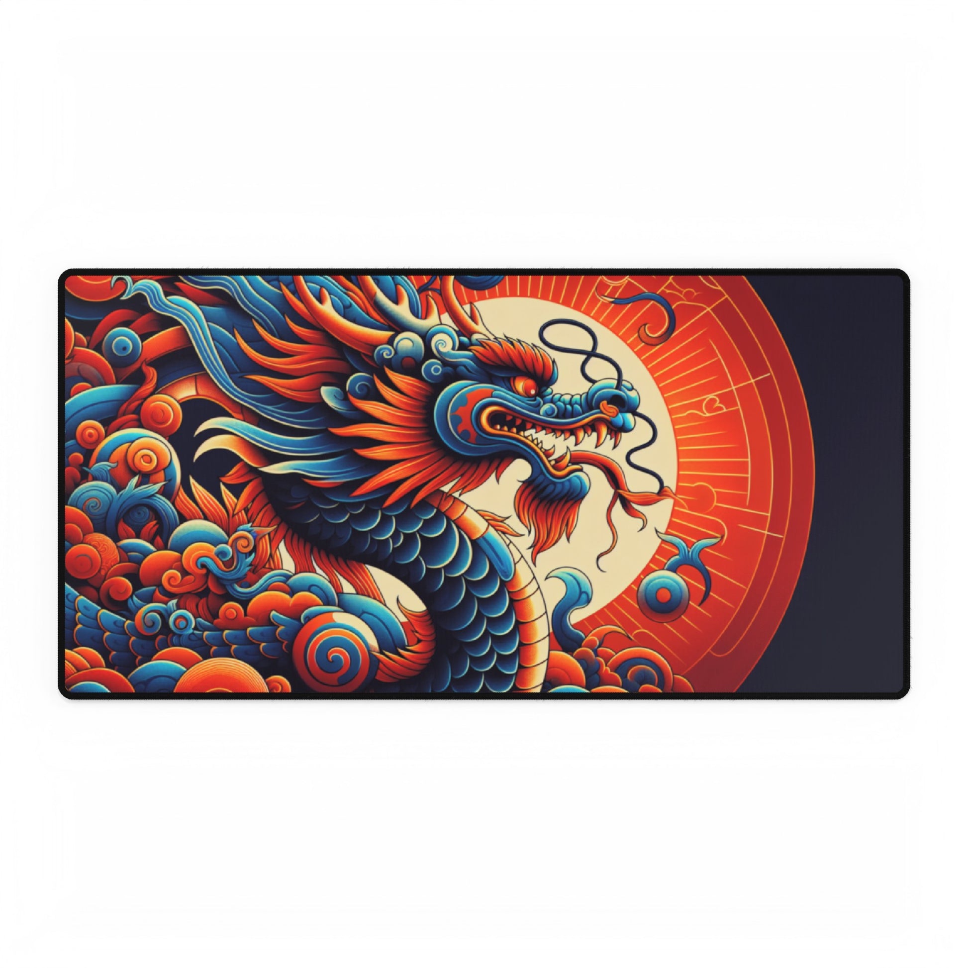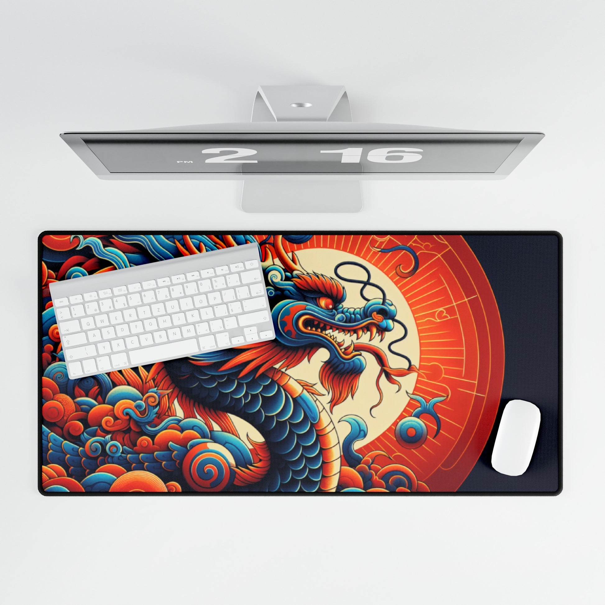 Add a touch of fiery flair to your workspace with the Revenge of the Chinese Dragon Desk Mat! This vibrant and intricately designed desk mat features a stunning, close-up depiction of a majestic Chinese dragon in bold orange and blue hues. The dragon's scales seem to shimmer and come alive on the mat's smooth surface, making it a unique and eye-catching addition to any office or home workspace. Made from high-quality materials, this desk mat is not only a stylish accessory, but also provides a smooth, comfortable surface for your wrists and hands to rest on while you work. Protect your desk from spills and scratches, and add a burst of mythical energy to your daily routine with the Revenge of the Chinese Dragon Desk Mat.