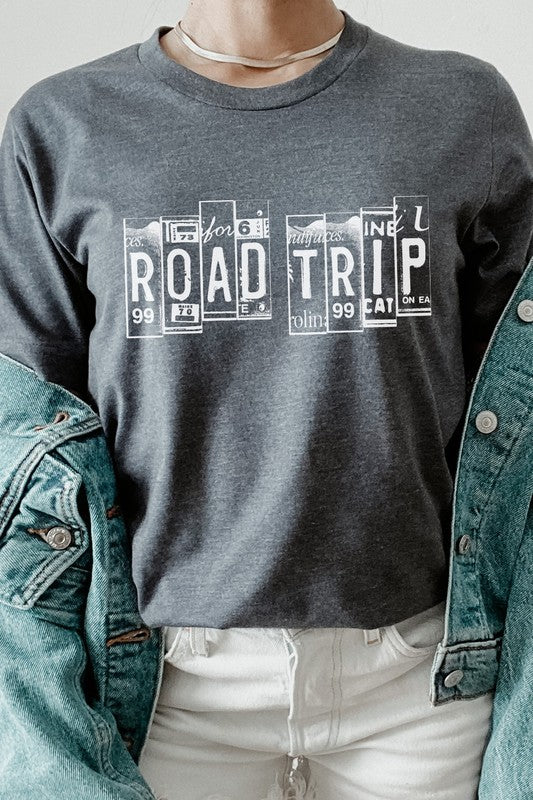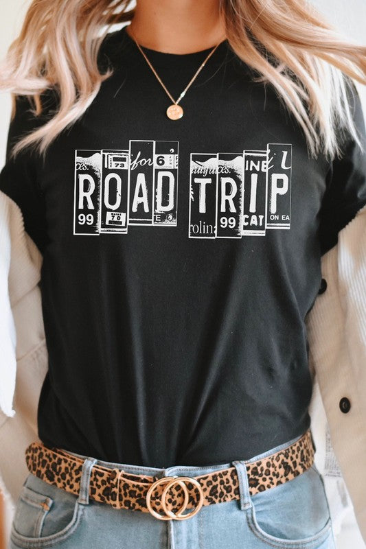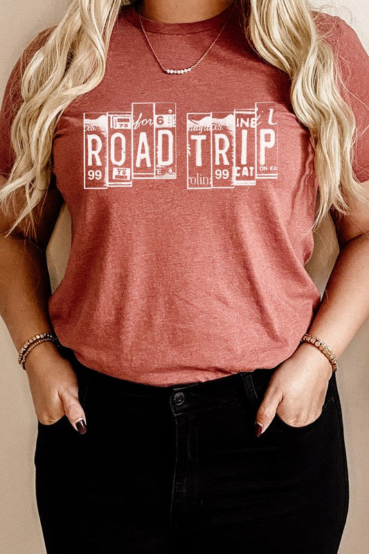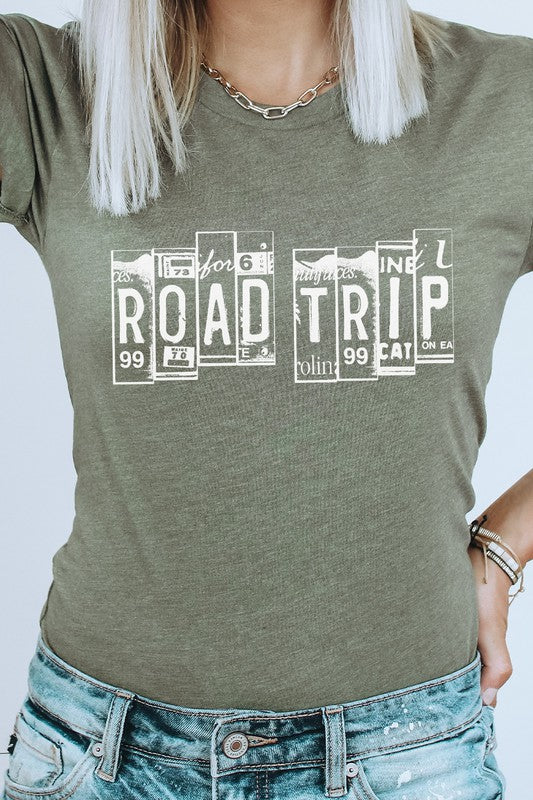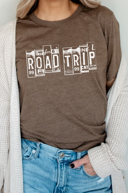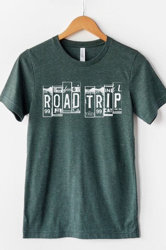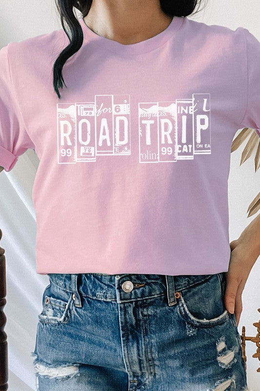 Presenting our Road Trip License Plate Vacation Graphic Tee from Kissed Apparel. This trendy and vibrant tee is perfect for those with a wanderlust spirit. Featuring a unique design inspired by license plates from road tripping, it captures the essence of a memorable road trip.Most t shirt colors are 52/48 cotton/poly blend, this tee offers both style and comfort for all your adventures. Get ready to hit the road and create unforgettable memories with our Road Trip Graphic T shirt.