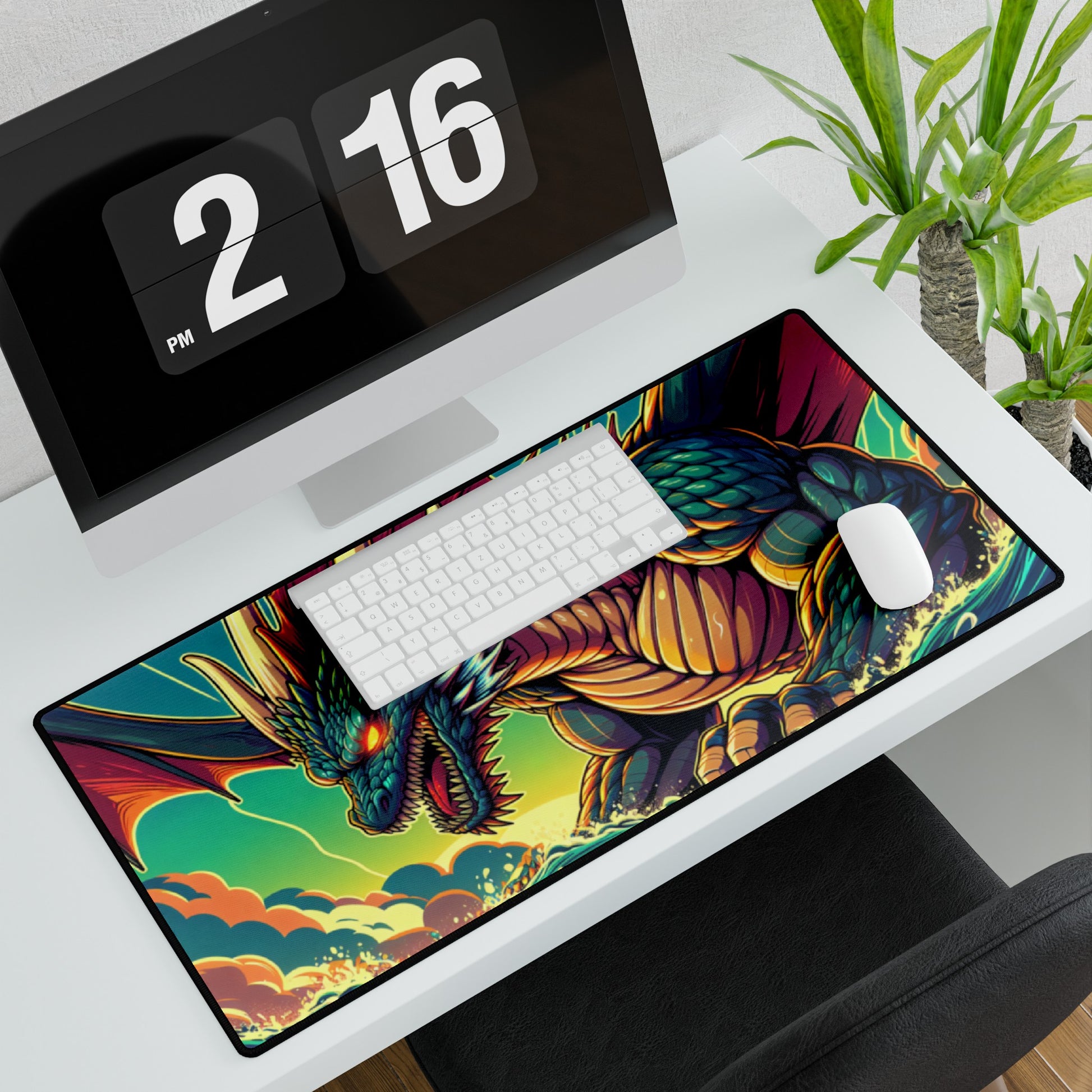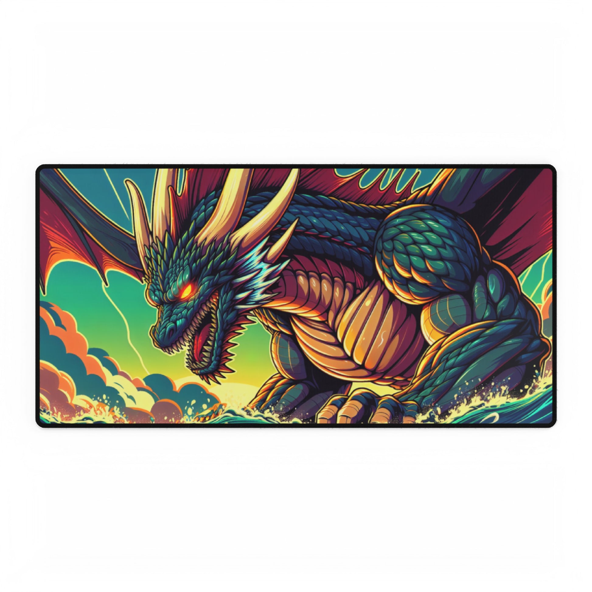 Add a splash of oceanic adventure to your workspace with the Sea Dragon Desk Mat and Mouse Pad. This stunning desk accessory features a beautifully illustrated sea dragon attacking a beach during sunset, transporting you to a world of fantasy and wonder. Made with high-quality materials, this desk mat provides a smooth, ergonomic surface for your wrists and hands to rest while working, while the built-in mouse pad ensures precise cursor control. The vibrant, full-color design will brighten up your workspace and spark conversation with coworkers and friends.