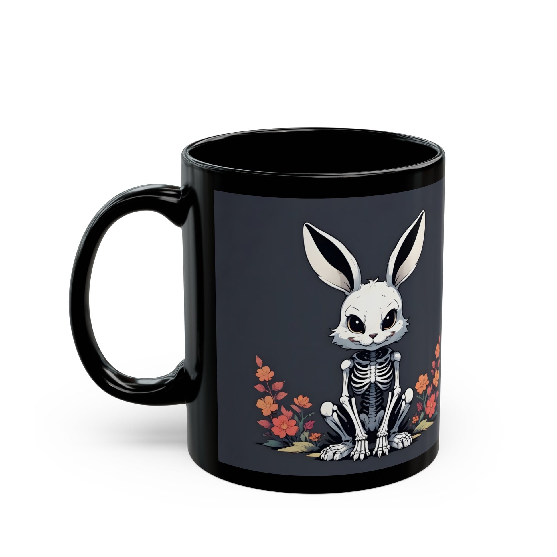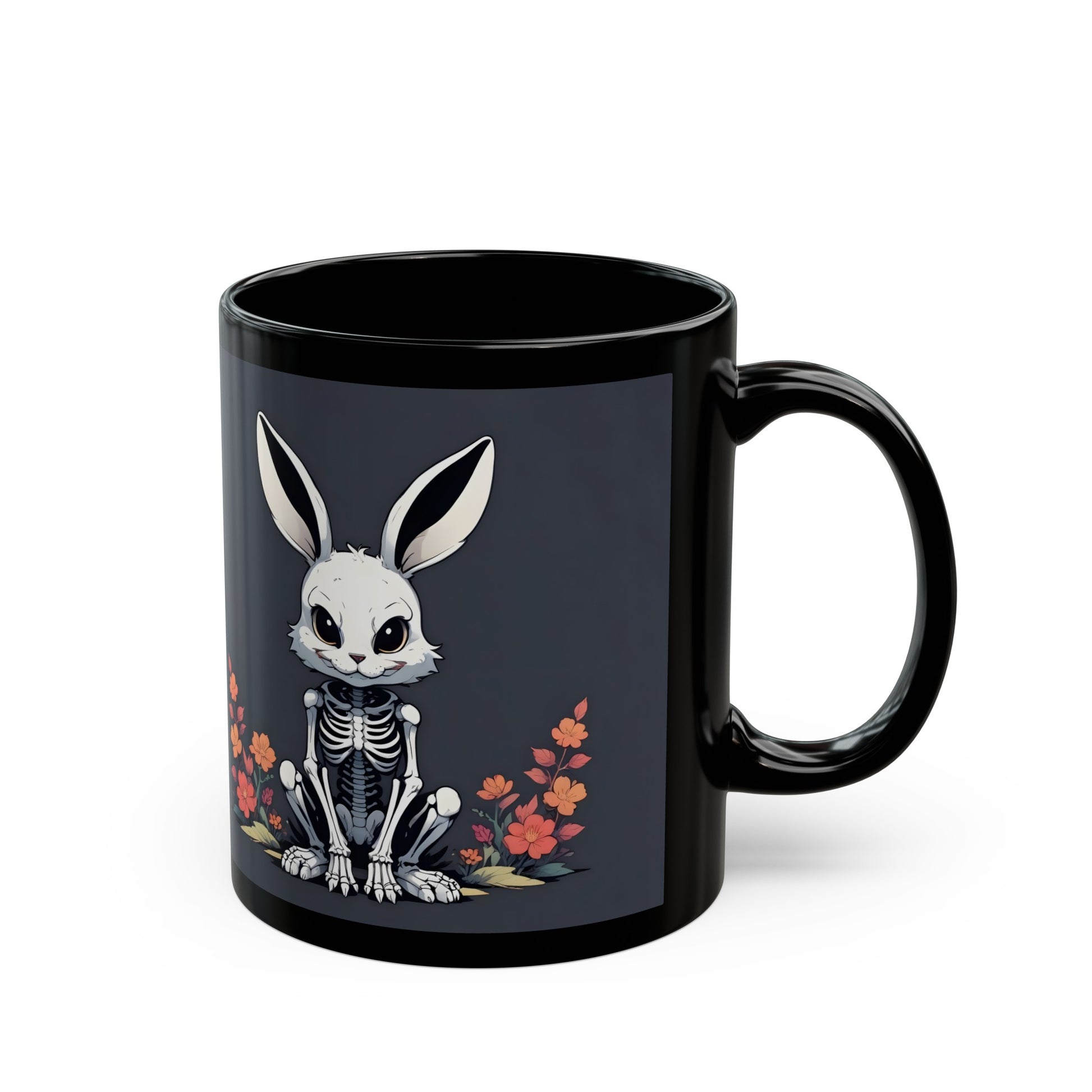 Add a touch of macabre magic to your morning coffee routine with this hauntingly beautiful Skeleton Goth Bunny Coffee Mug. Featuring a striking design of a bunny-faced skeleton surrounded by vibrant orange flowers on a dark grey background, this mug is sure to cast a spell of delight on your daily grind.