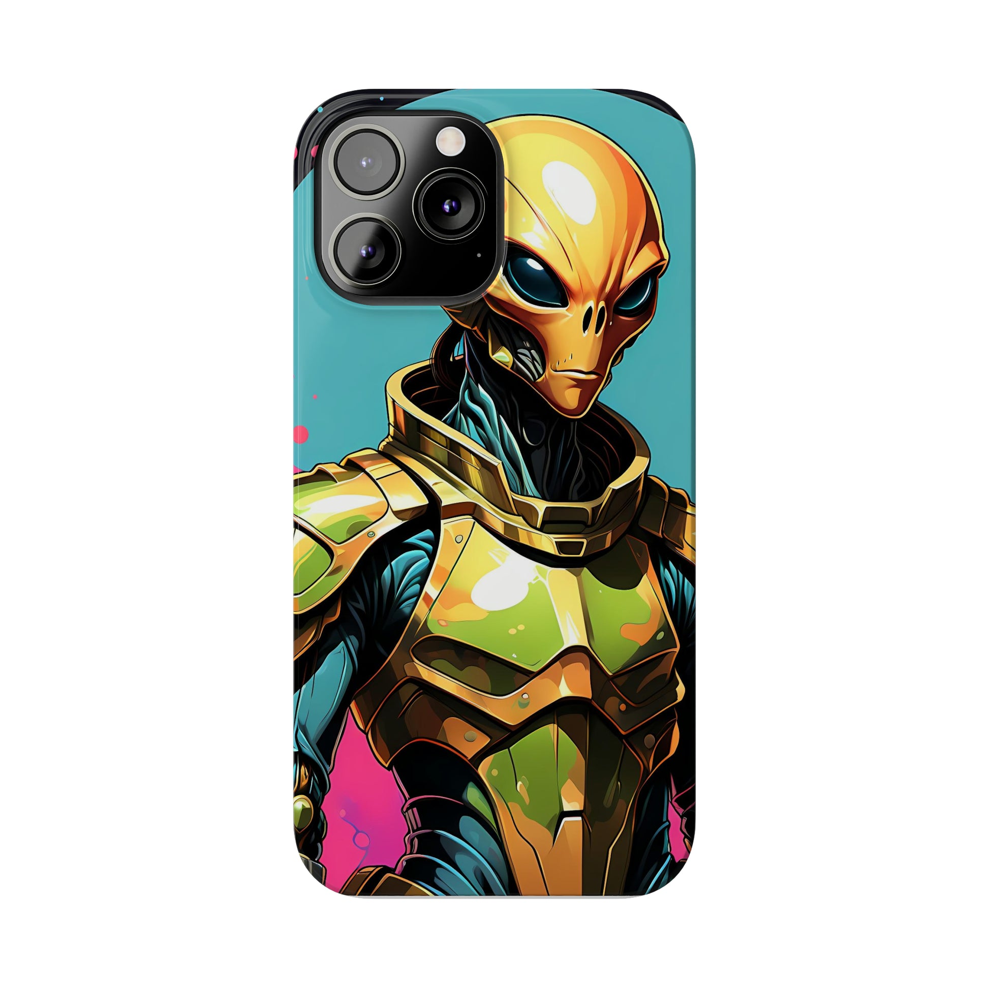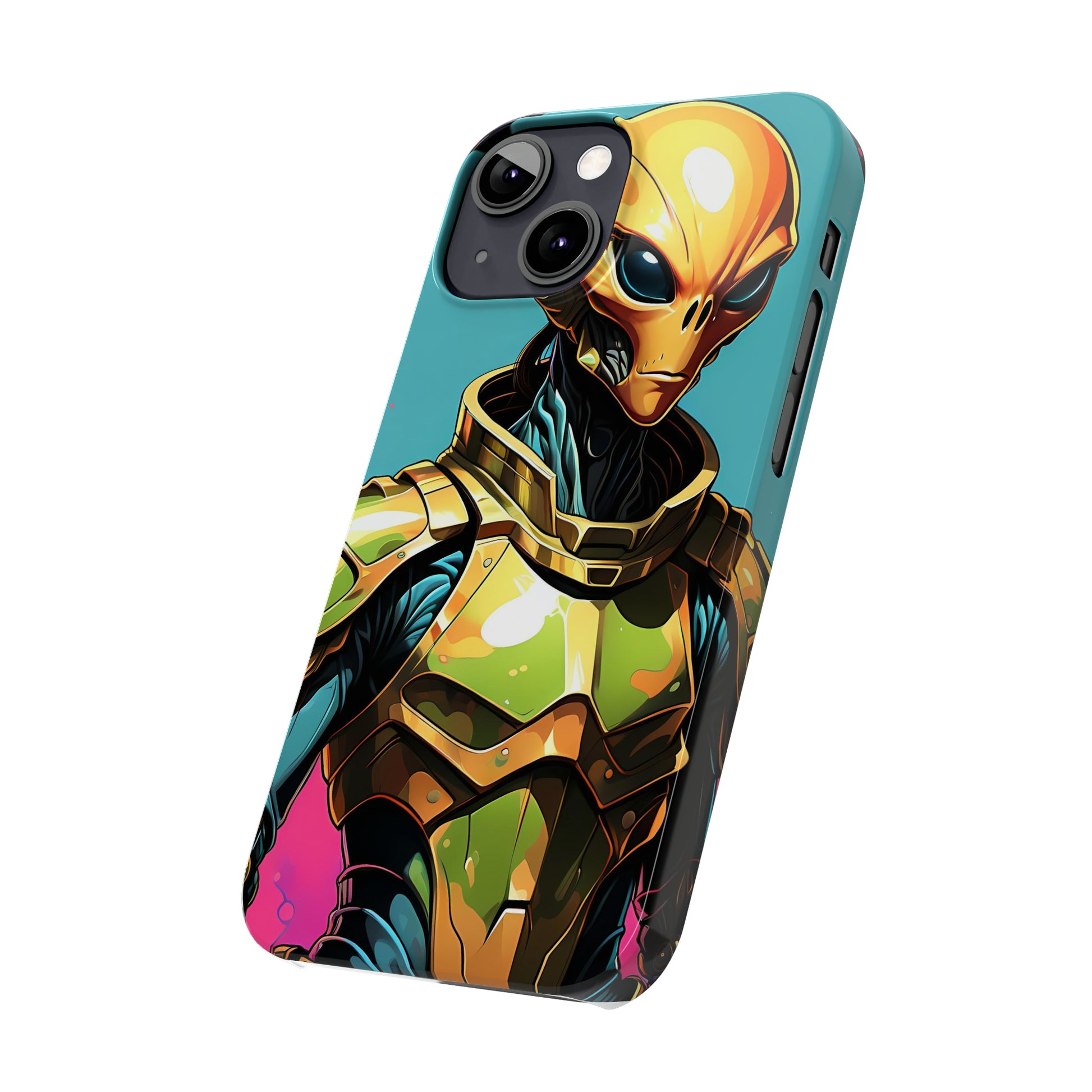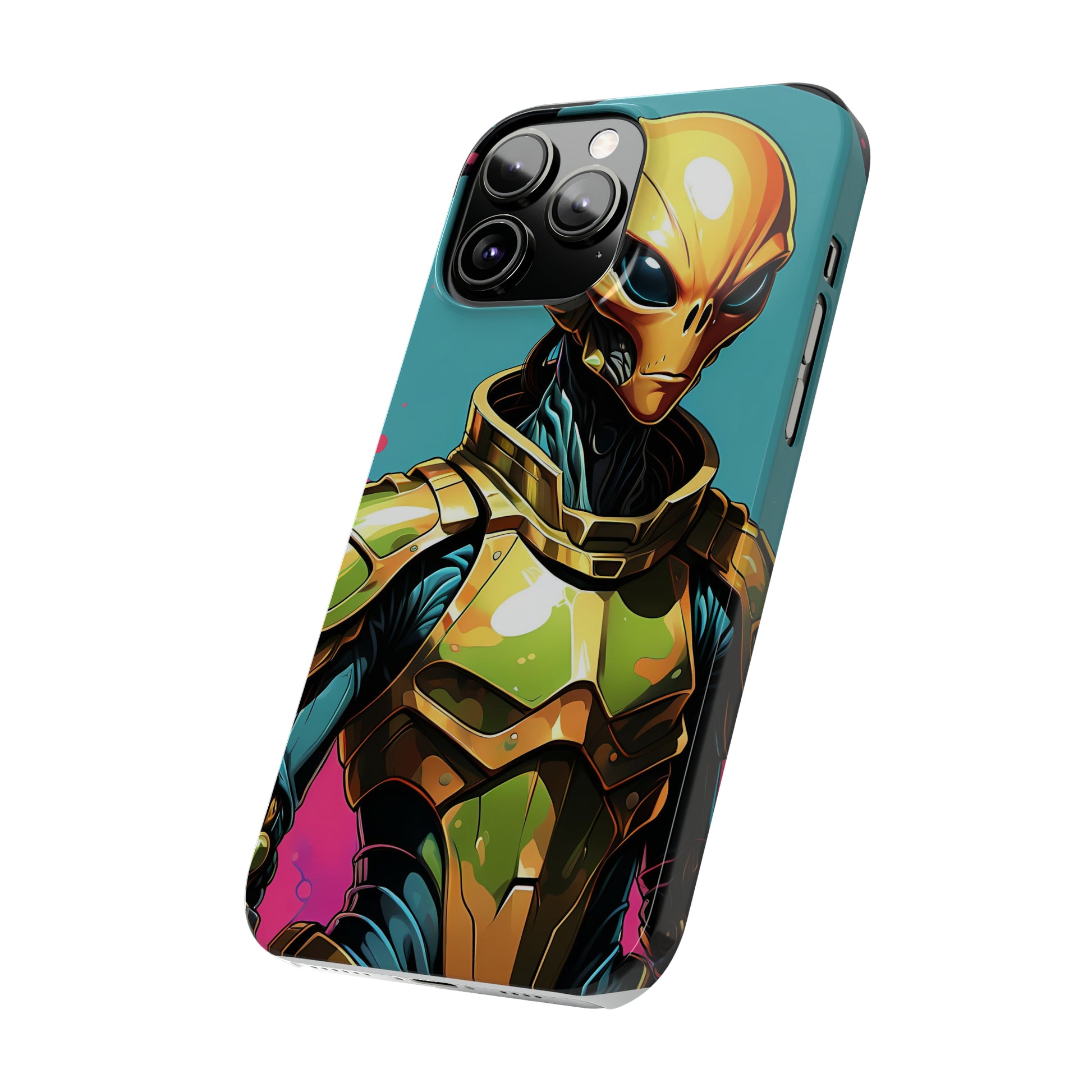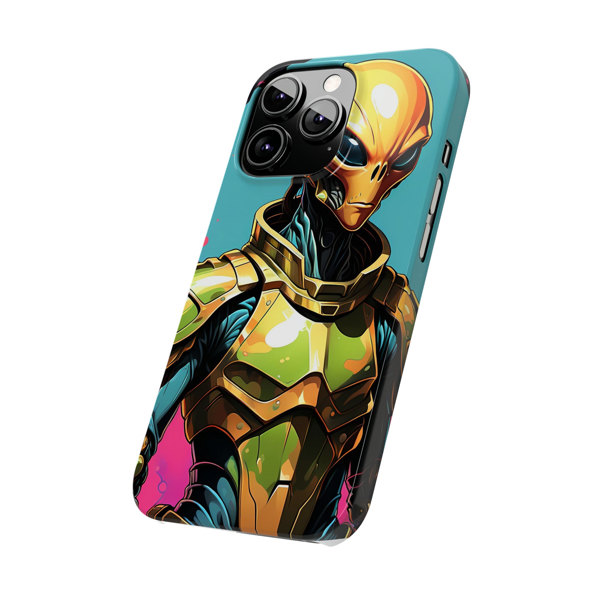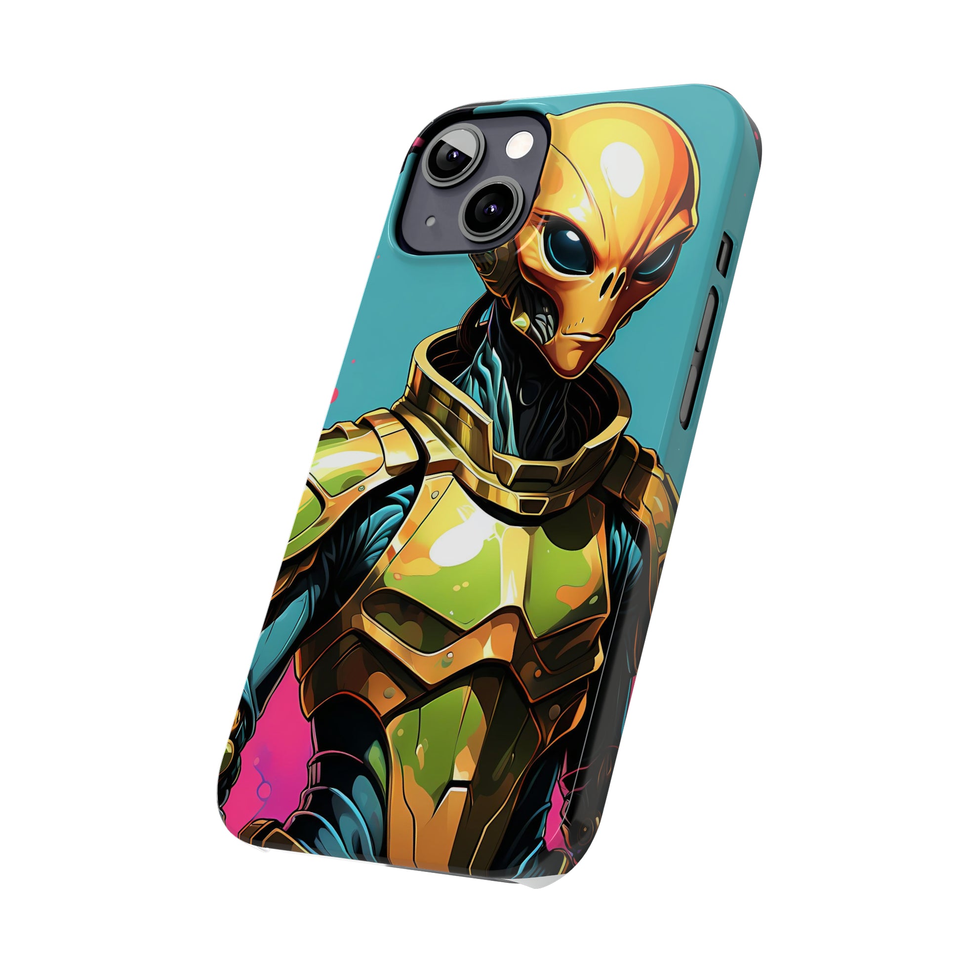 This is the perfect accessory for those who love futuristic, vibrant designs. With an illustration of an alien cyborg in armor ready for battle, this case combines bright colors and a comic anime style to make your iPhone stand out from the crowd. Not only does it provide protection for your phone, but it also adds a touch of personality and style to your everyday life. Show off your love for all things sci-fi and embrace your inner geek with this eye-catching phone case.