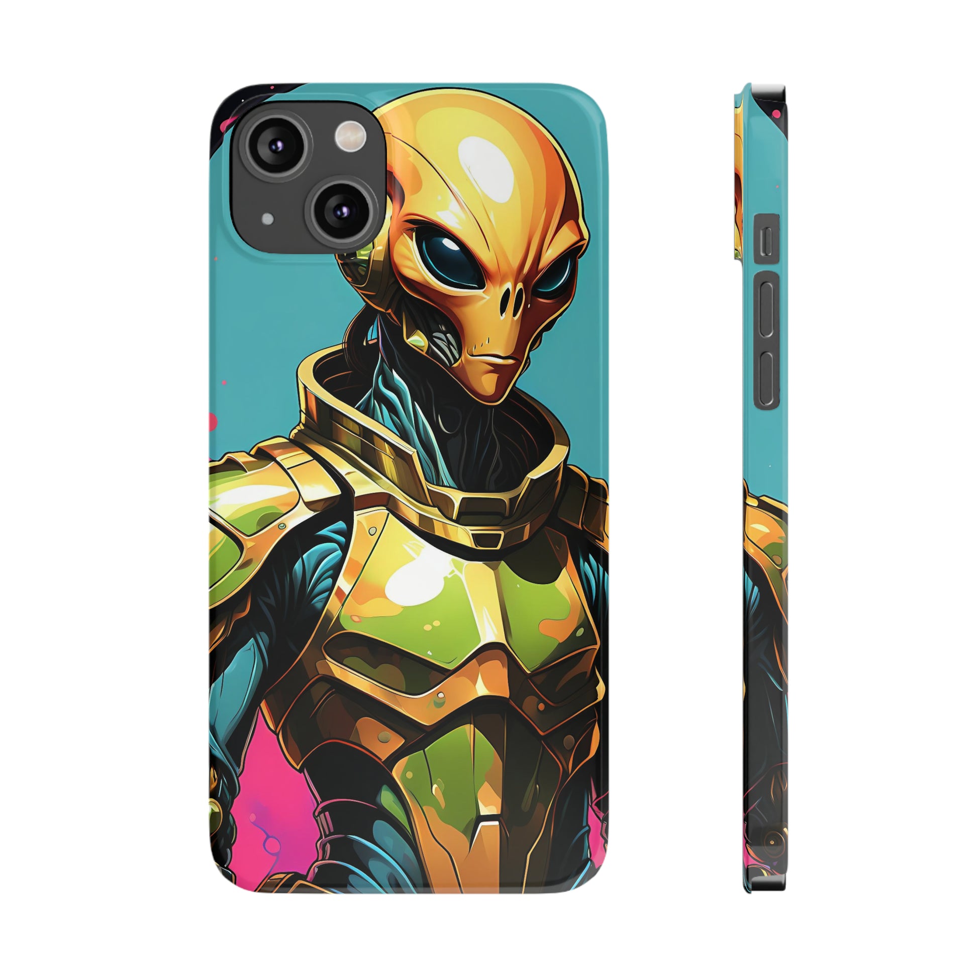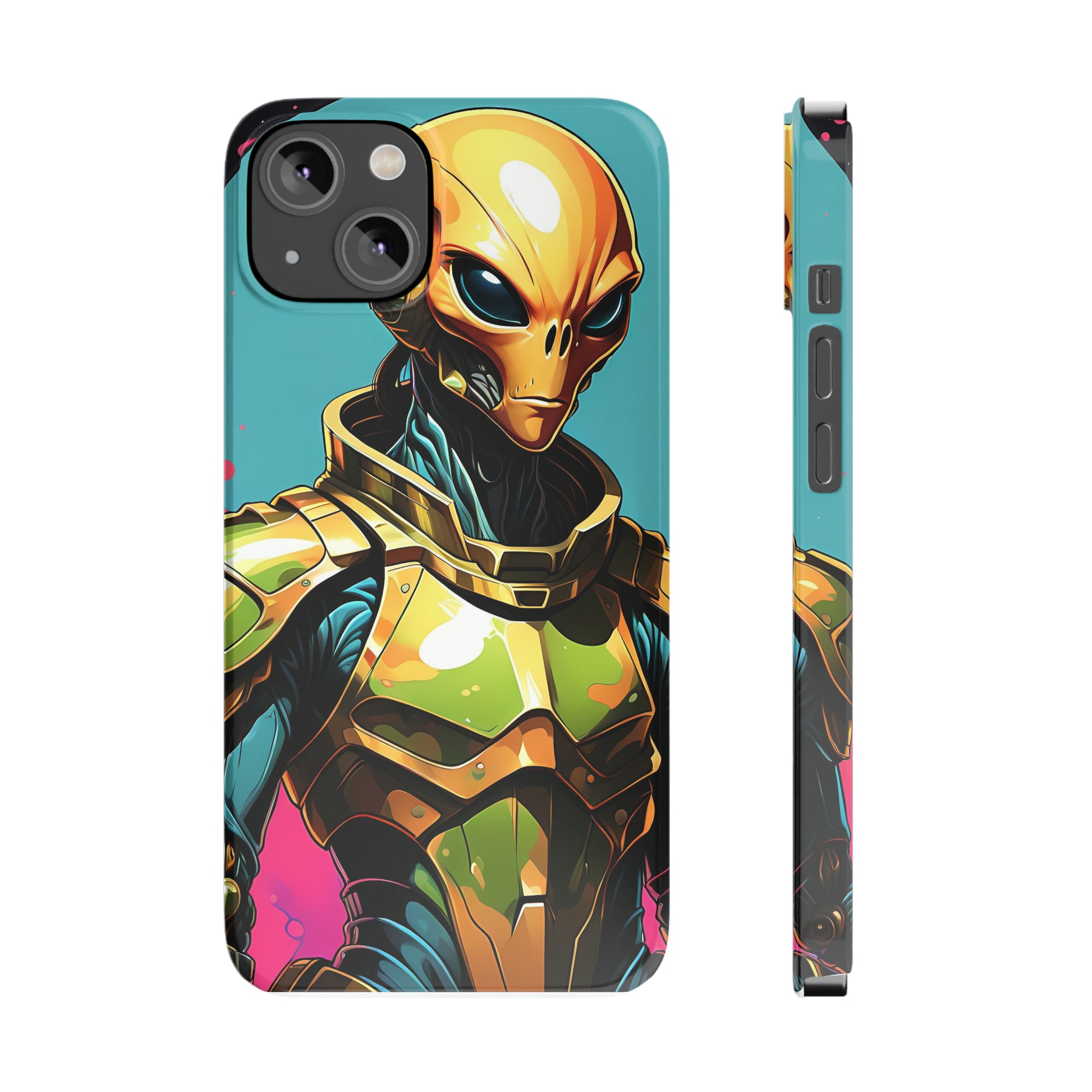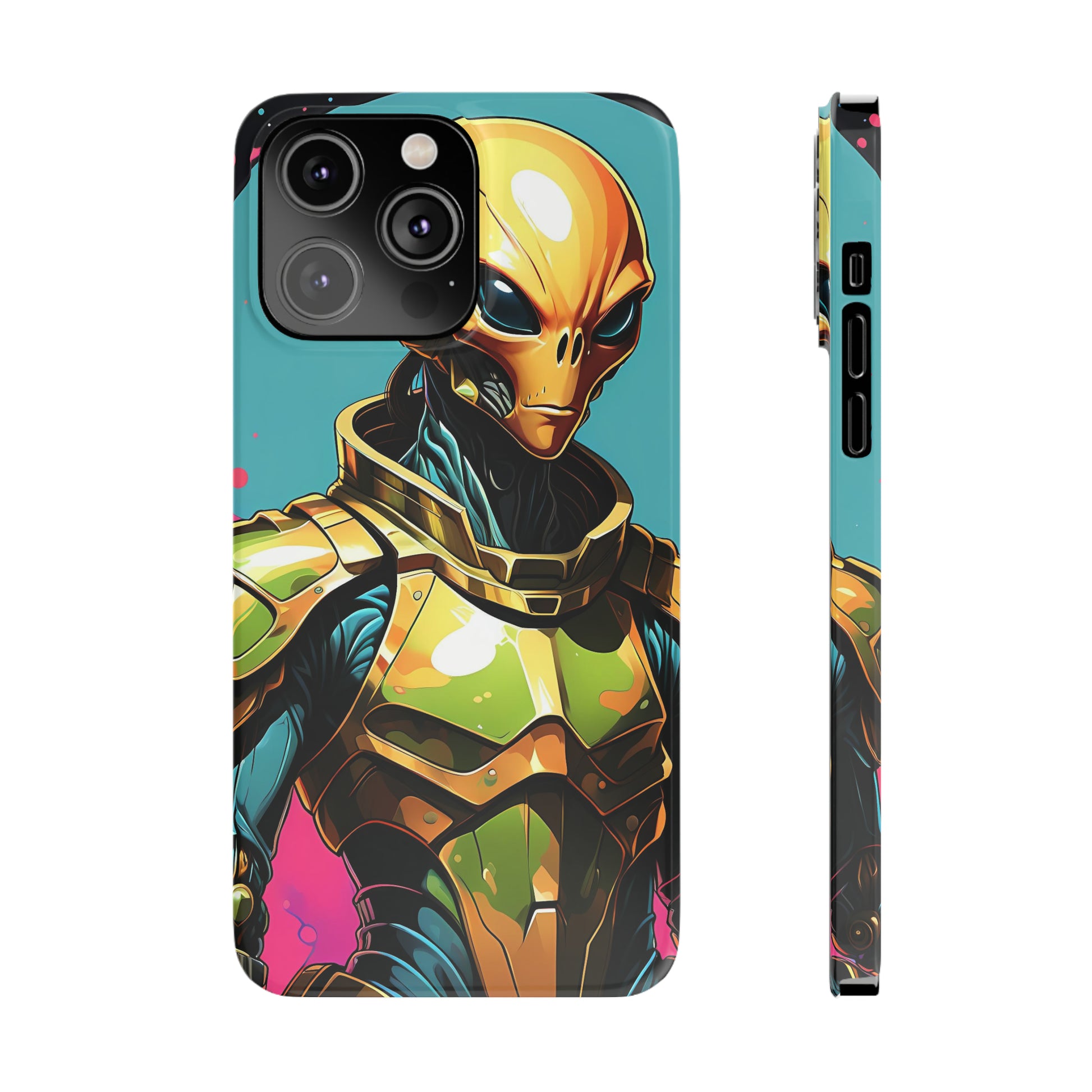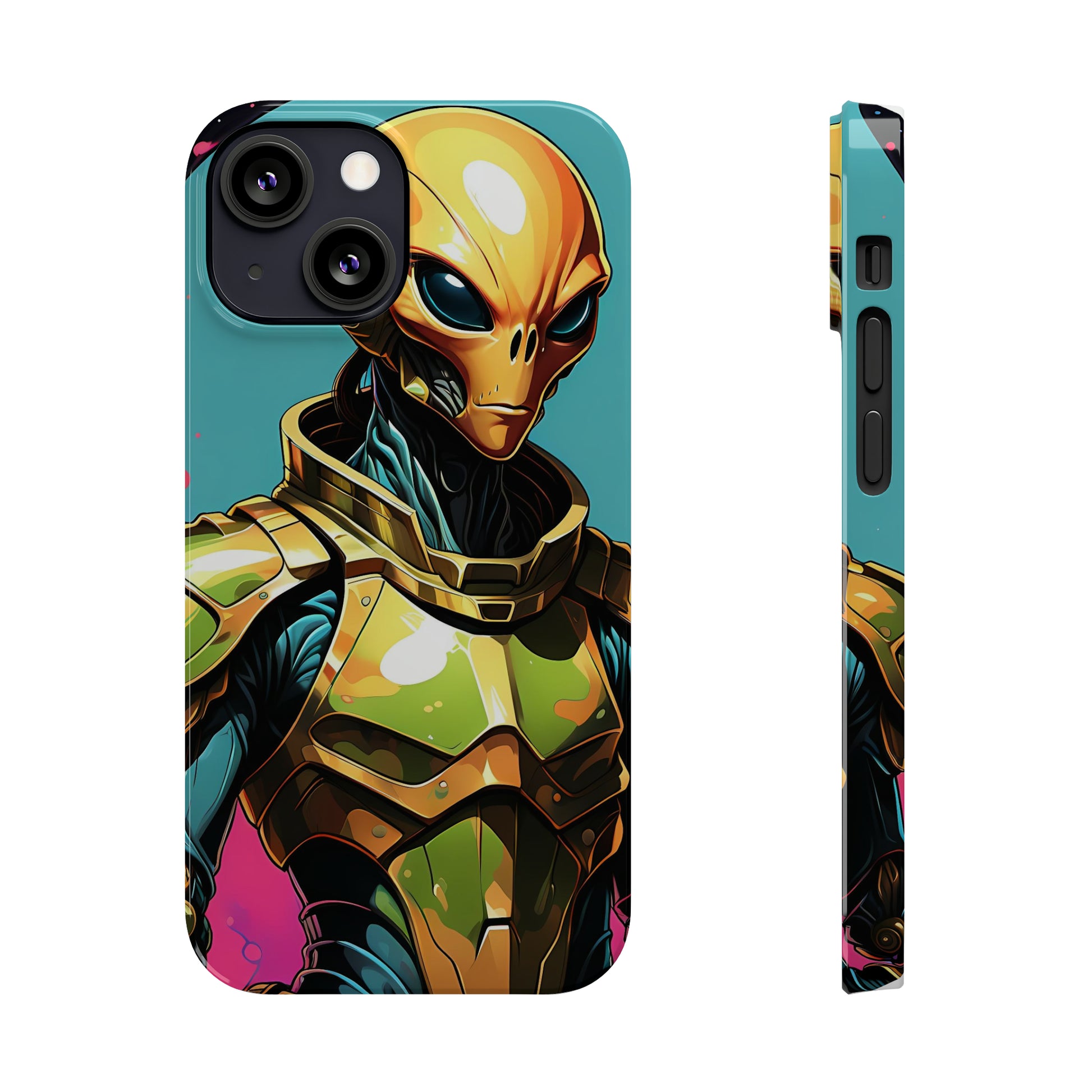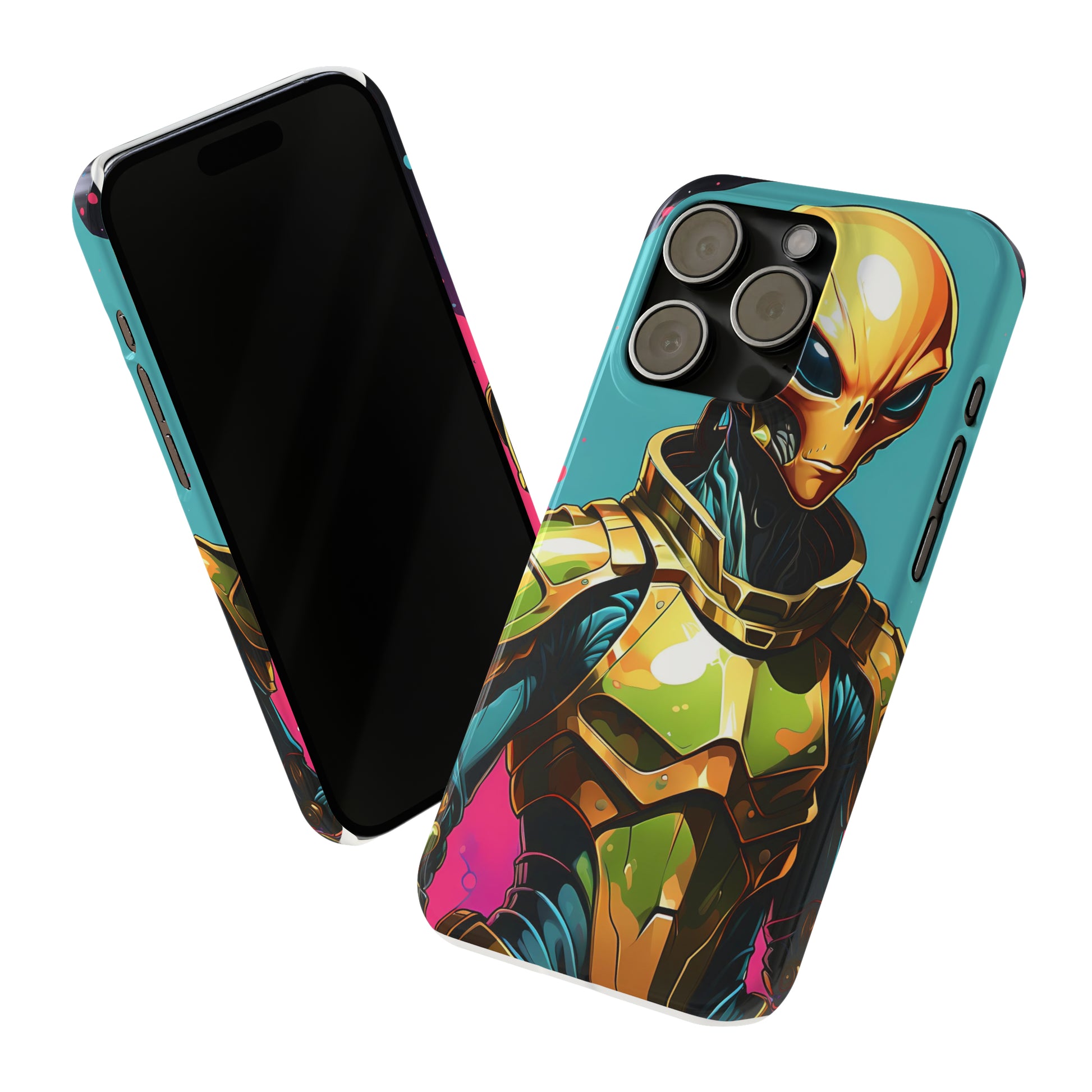 This is the perfect accessory for those who love futuristic, vibrant designs. With an illustration of an alien cyborg in armor ready for battle, this case combines bright colors and a comic anime style to make your iPhone stand out from the crowd. Not only does it provide protection for your phone, but it also adds a touch of personality and style to your everyday life. Show off your love for all things sci-fi and embrace your inner geek with this eye-catching phone case.