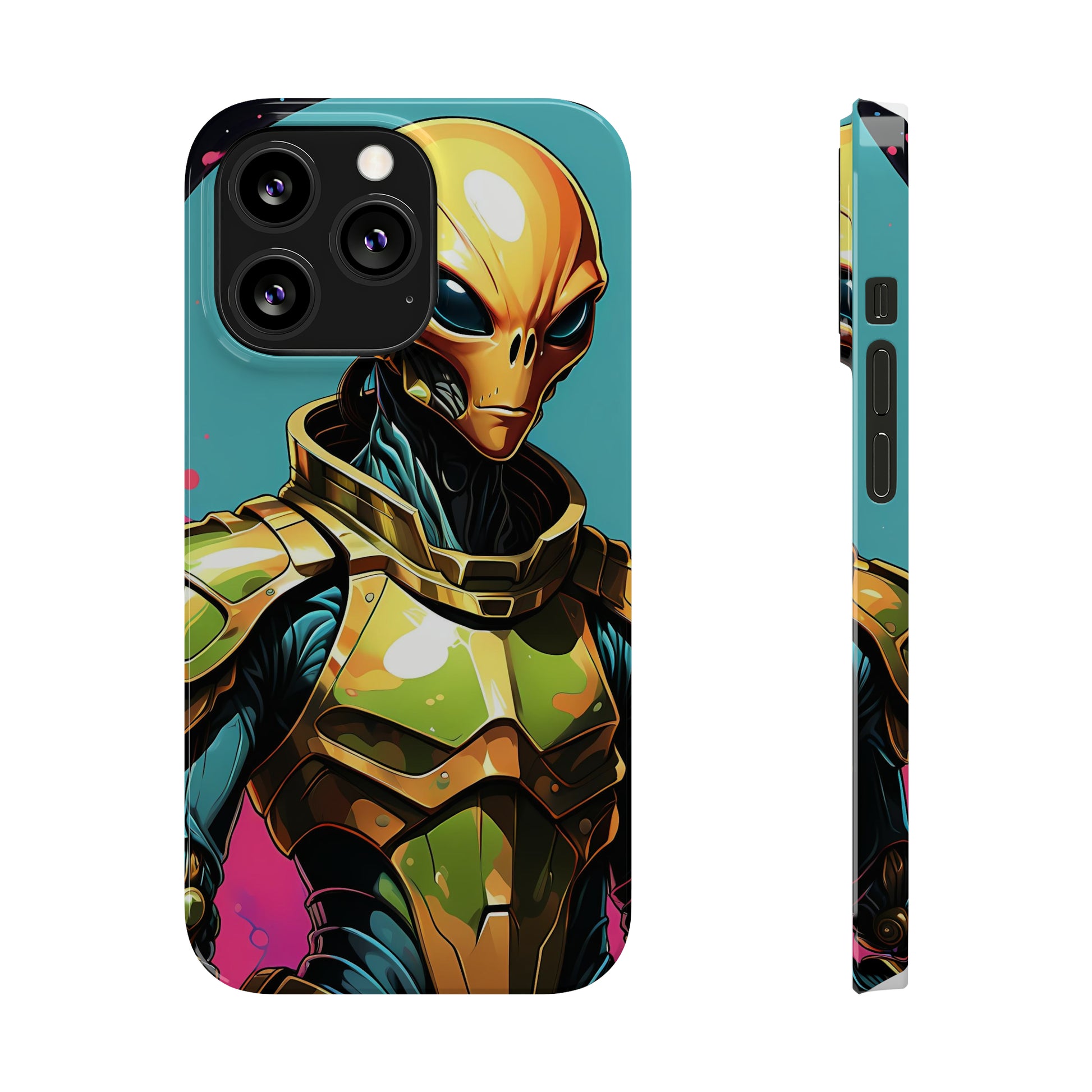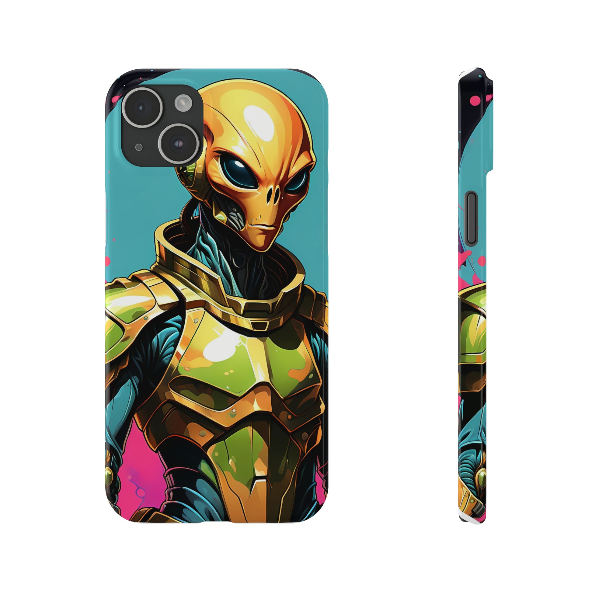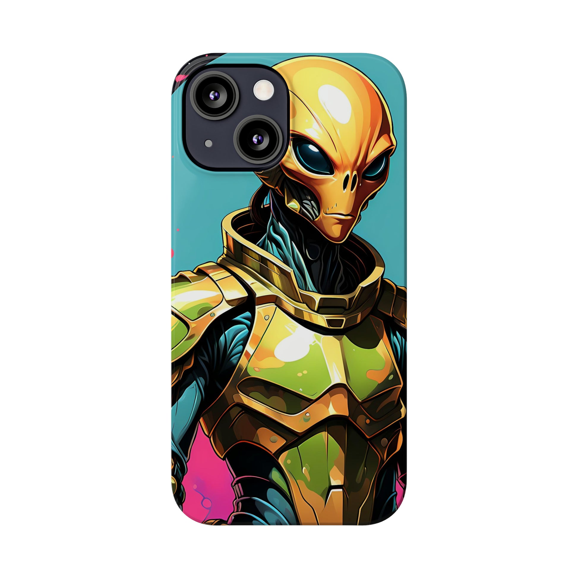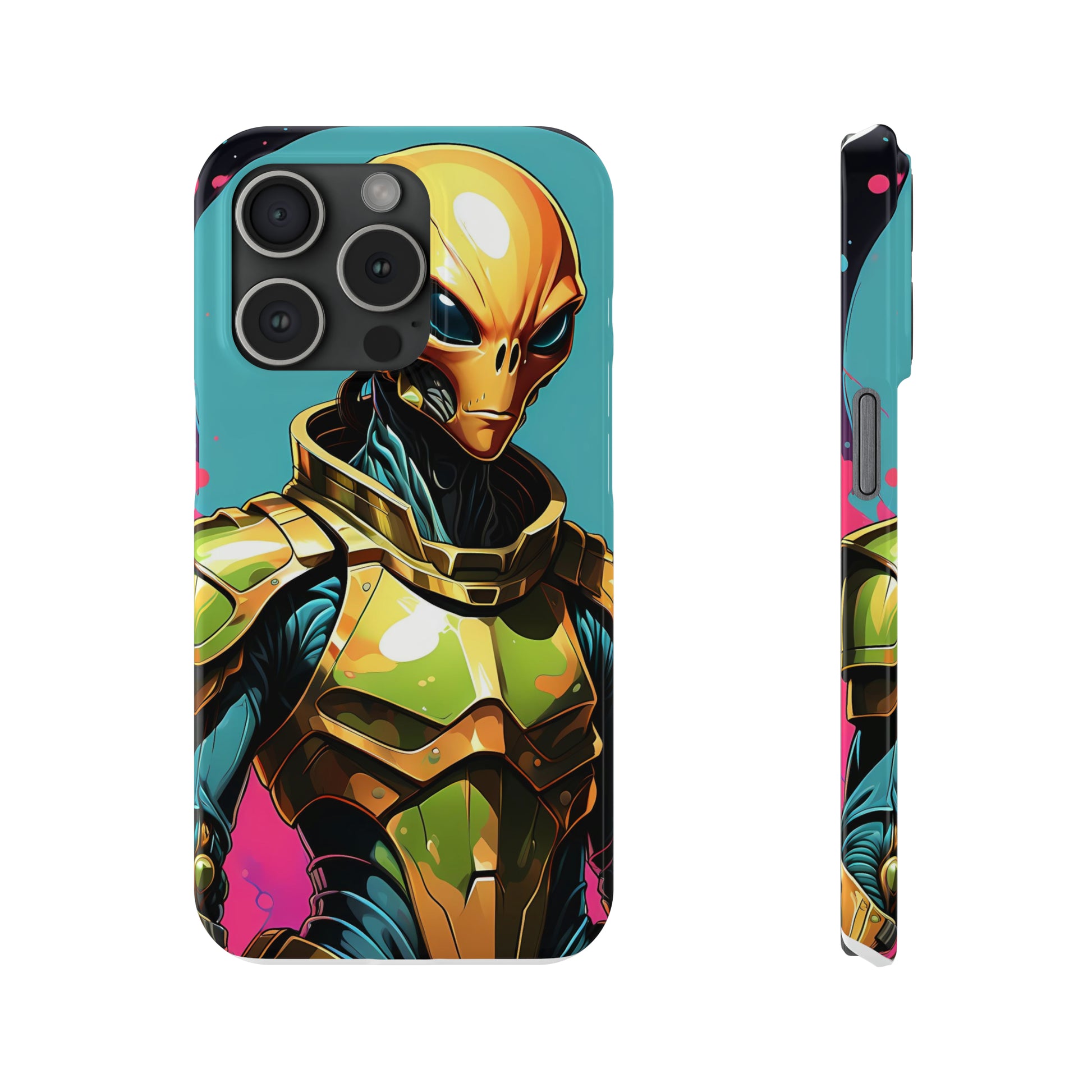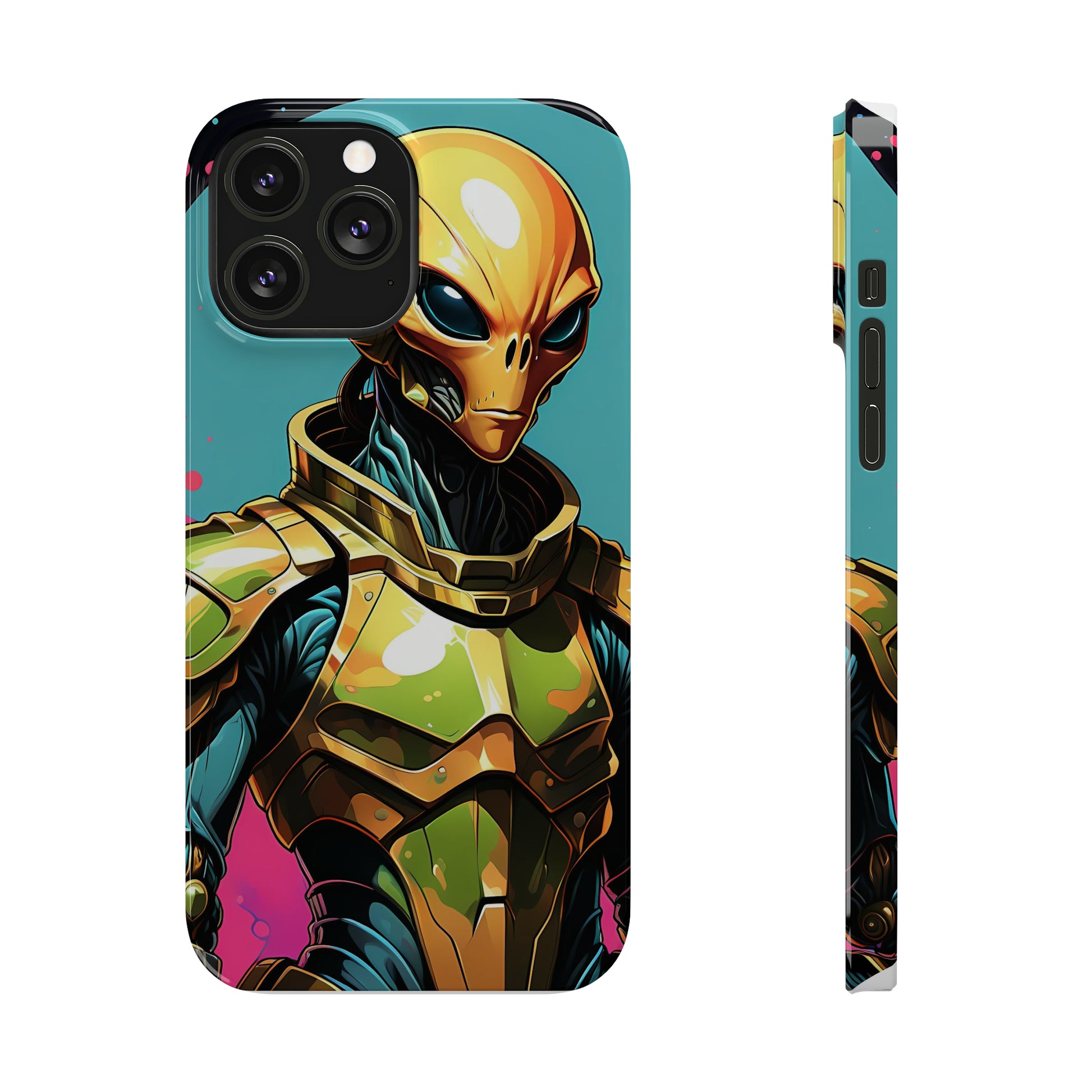 This is the perfect accessory for those who love futuristic, vibrant designs. With an illustration of an alien cyborg in armor ready for battle, this case combines bright colors and a comic anime style to make your iPhone stand out from the crowd. Not only does it provide protection for your phone, but it also adds a touch of personality and style to your everyday life. Show off your love for all things sci-fi and embrace your inner geek with this eye-catching phone case.