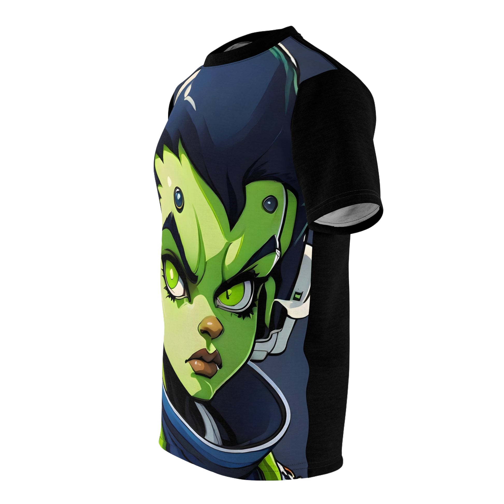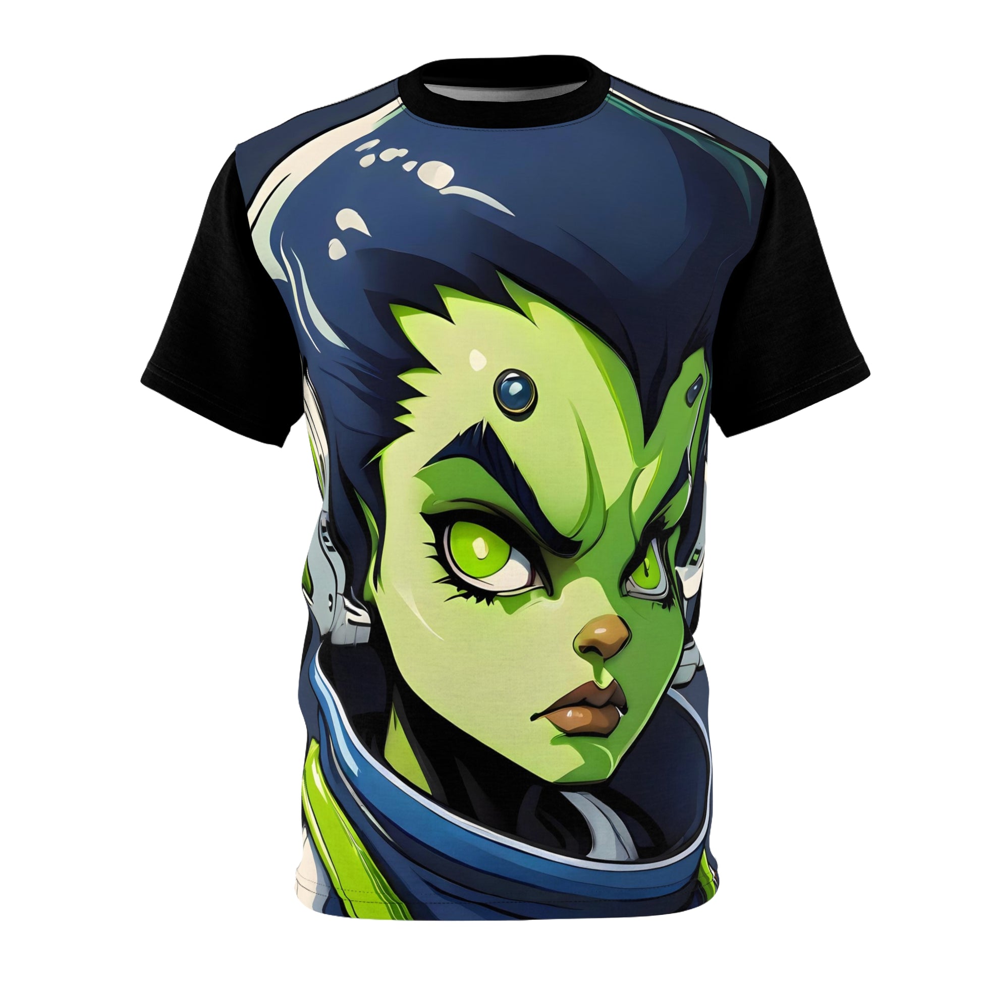 Introducing the Alien Visitor T-Shirt, the perfect blend of beauty and otherworldly charm. This stunning all-over print shirt features a mesmerizing illustration of a green female alien, capturing the essence of cool, edgy sci-fi style. Our graphic tee showcases intricate details and a captivating design that will surely turn heads and spark conversations. Step into a world beyond imagination with the Alien Visitor T-Shirt, and let your style speak for itself.